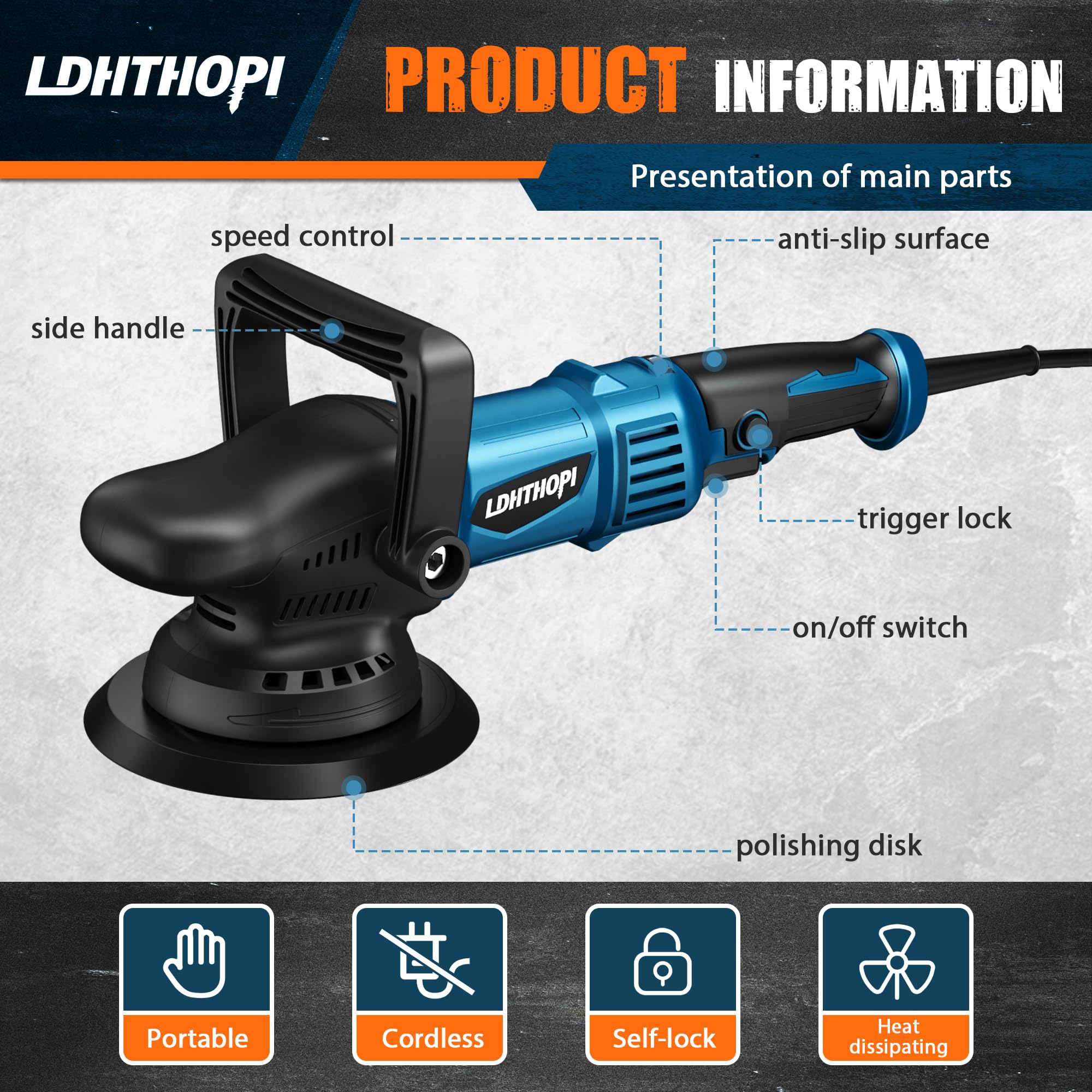 【Dual Action Polisher】The buffer polisher for car detailing comes with detachable D-handle and side handle so you can choose the way to hold it as you like. With switch lock design, you can keep the speed by lock down the button.