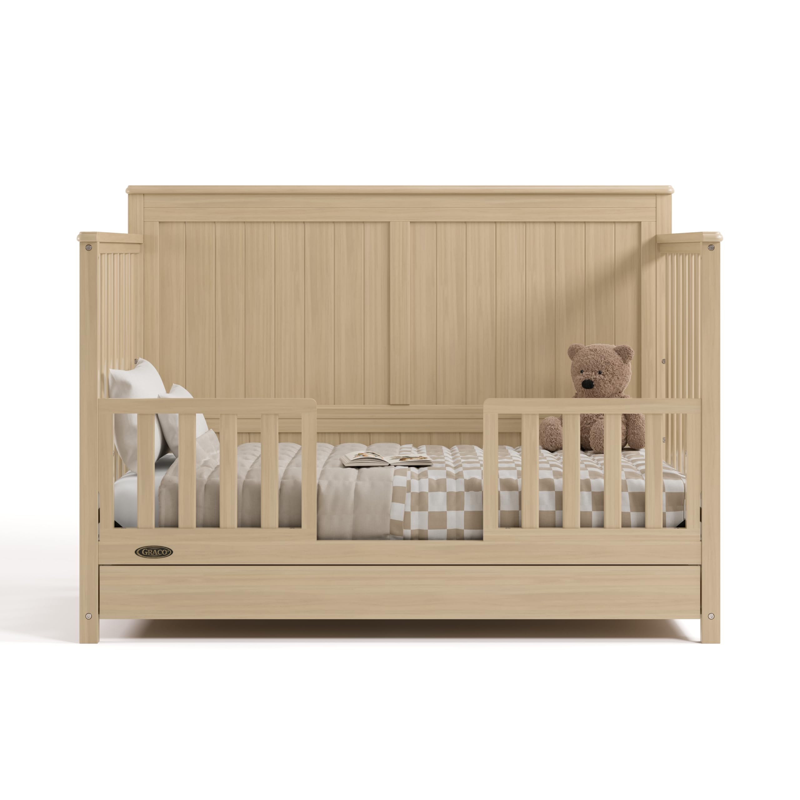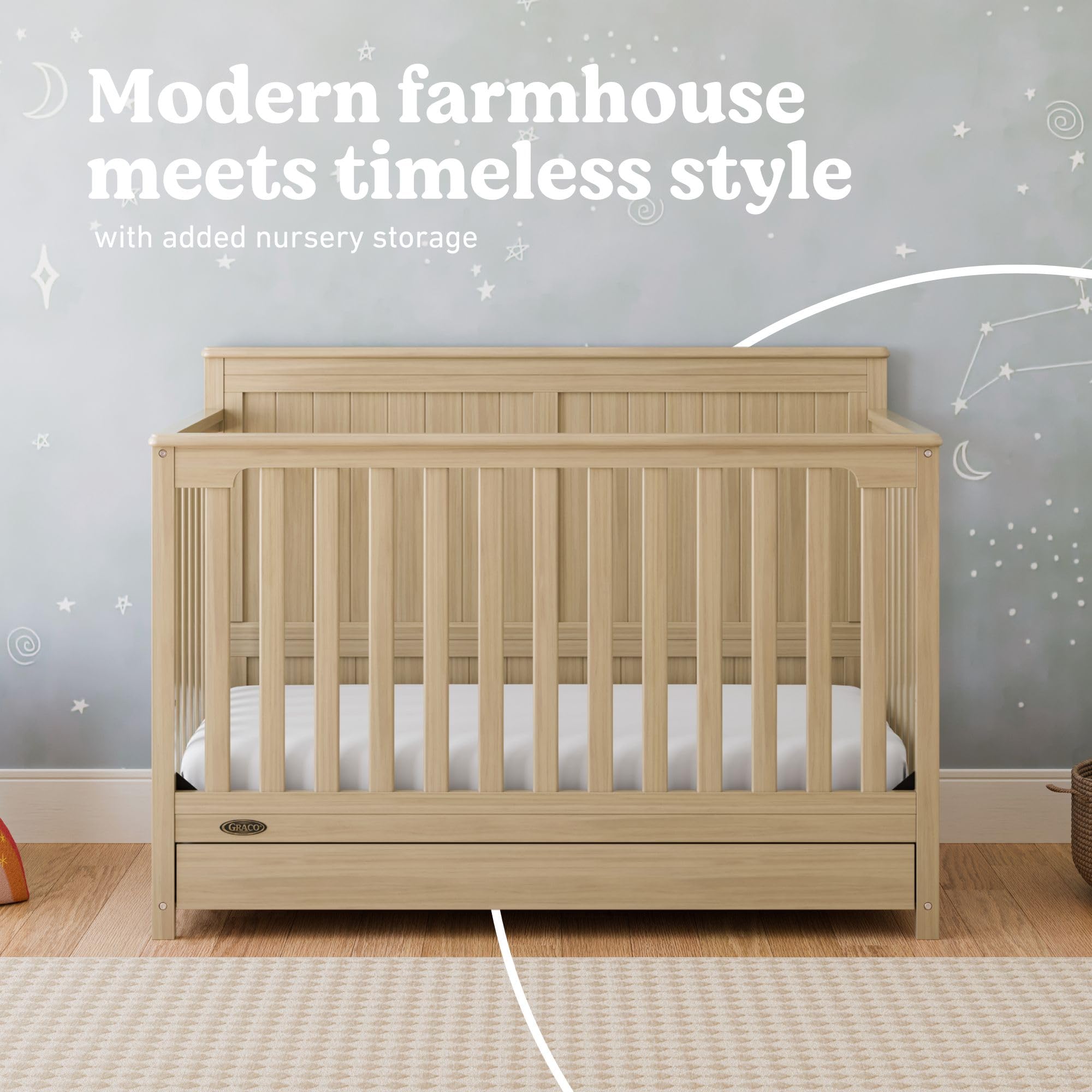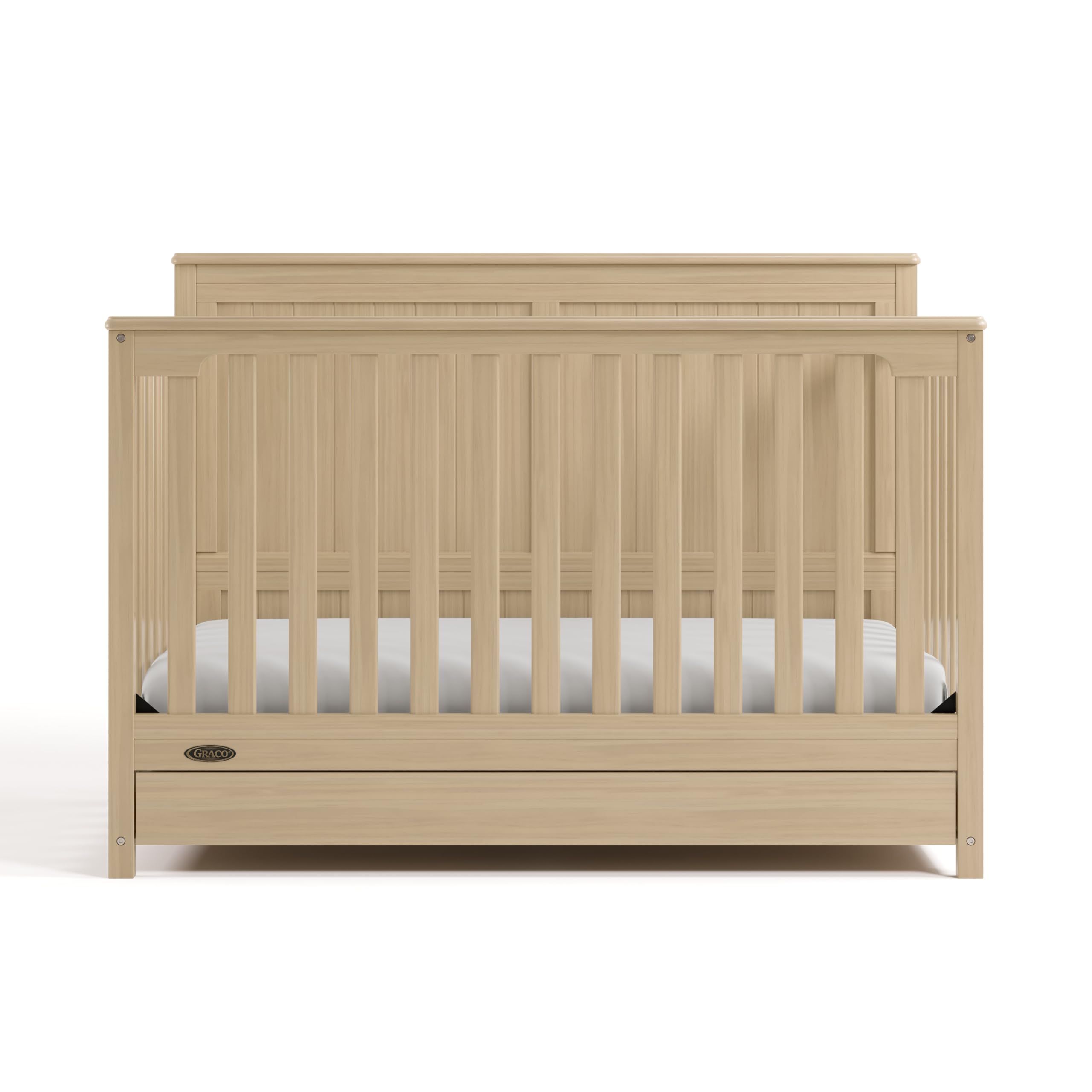 Bring your dream nursery to life with the Graco Hadley 5-in-1 Convertible Crib with Drawer. With its full-panel headboard, full-size under-crib storage drawer, and timeless design, the Hadley is the perfect addition to any nursery. The Hadley is crafted from pine wood, engineered wood, wood composites, and includes Euro drawer glides, and its applied finish has been tested to meet or exceed the applicable ASTM and CPSIA safety standards. Also, the Hadley is Baby Safety Alliance Verified — meaning it has been expert tested by third-party, accredited laboratories to meet or exceed all of the applicable category voluntary and mandatory safety standards. Designed to adapt to your growing baby, the Hadley is equipped with an adjustable mattress support base with 4 different height options, so the mattress support base’s position can be lowered as your child grows [please note, this crib may only be used until your child can easily climb out or is taller than 35 inches (89 cm)]. To support your child’s journey from babyhood to toddlerhood and beyond, the Hadley can be converted from a crib to a toddler bed [compatible Graco Toddler Safety Guardrail (Slats) – 01350-30 Series sold separately)], daybed, and full-size bed with headboard and optional footboard (compatible full-size bed conversion kit sold separately). The Hadley is designed to accommodate any standard full-size crib & toddler mattress (mattress sold separately – we recommend any Graco crib mattress). Graco is the proud recipient of the Parent Tested Parent Approved (PTPA) Seal of Approval for nursery and children’s bedroom furniture, and the 2021-2023 Women's Choice Award for 9 out of 10 Recommended Baby & Kids Furniture. Backed by a 1-year limited manufacturer’s warranty. Assembly required. Mattress, guardrail kit, and full-size bed conversion kit each sold separately.