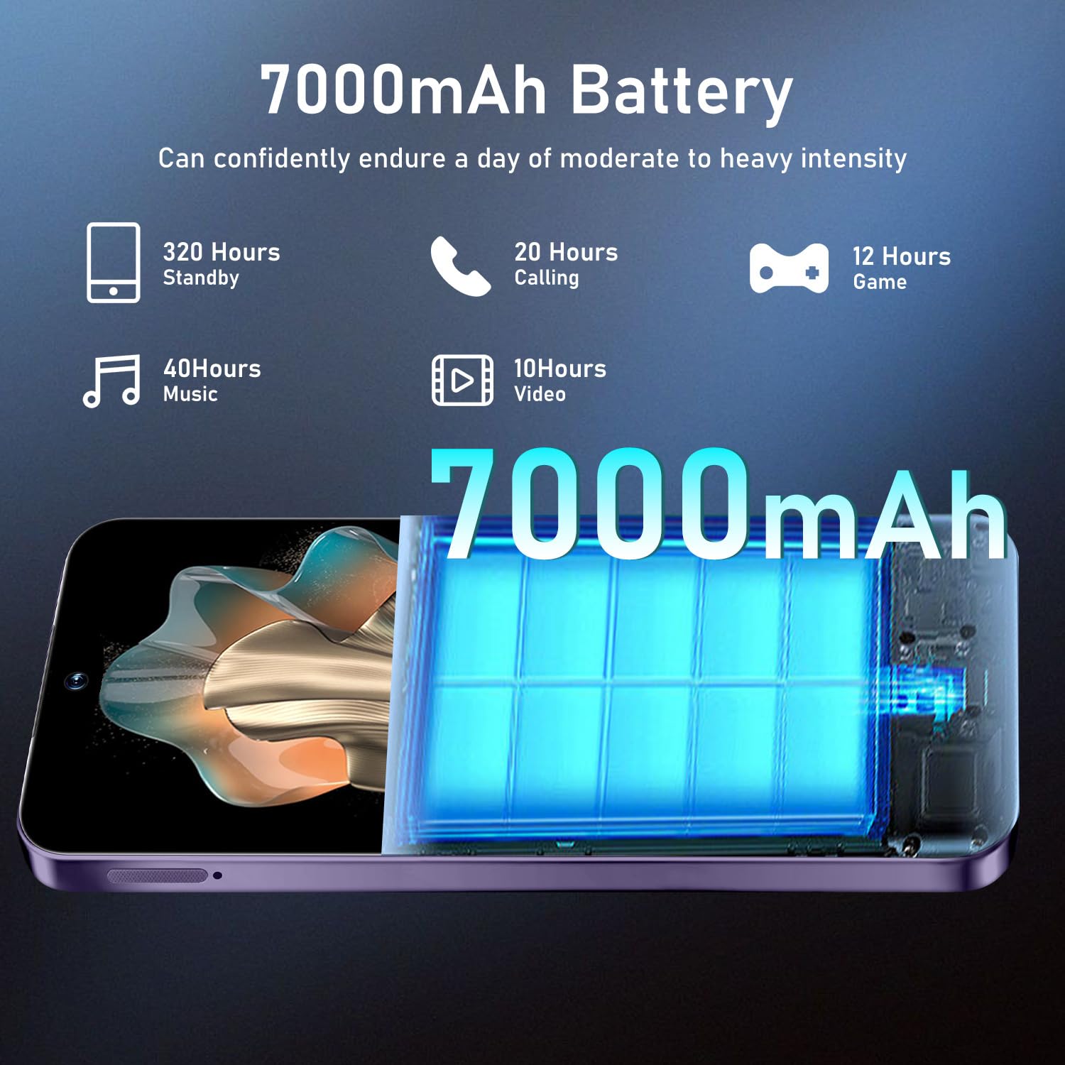 đ±ăLONG LASTING BATTERYă. With the 7000mAh big battery and own battery saving technology, smartphone unlocked can confidently last a full day of medium-to-heavy use without charging. Equipped with 20W fast charging, it can charge quickly when you needed