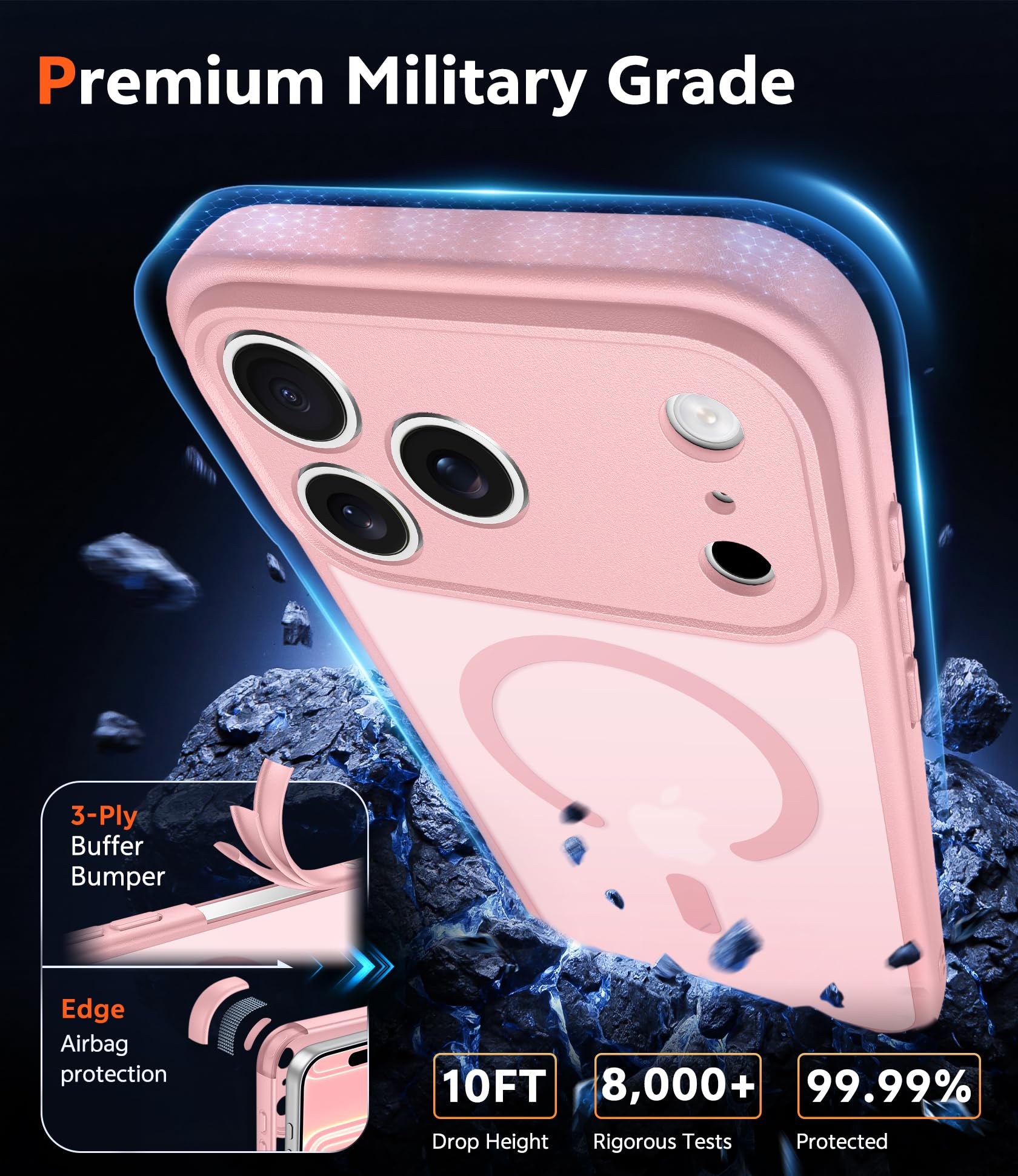 10FT Military Grade Protection: Passed Military Drop Tested up to 10FT. This iPhone 17 pro case backplane is made with rigid polycarbonate and flexible shockproof TPU bumpers around the edge and features 4 built-in corner Airbags to absorb impact, which can prevent your Phone from accidental drops, bumps, and scratches