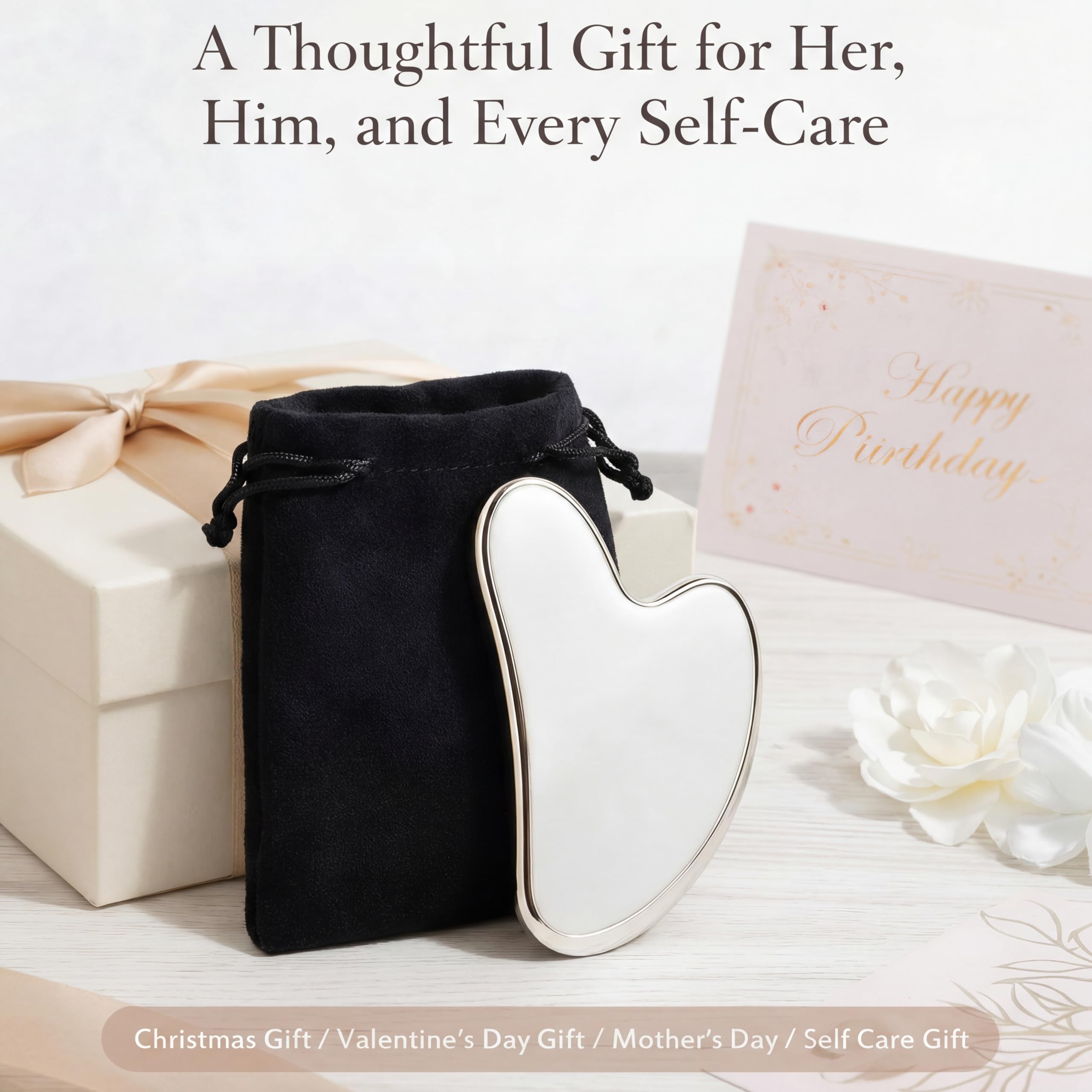 Ideal Self-Care Gift Set: Our gua sha stainless steel (3.5x2.2x0.14 in, 85-90g) comes with a sleek velvet travel pouch for compact storage and effortless portability; It's a nice skin care gift for busy individuals, therapists, coaches, or loved ones on Christmas, Mother's Day, or Valentine's Day