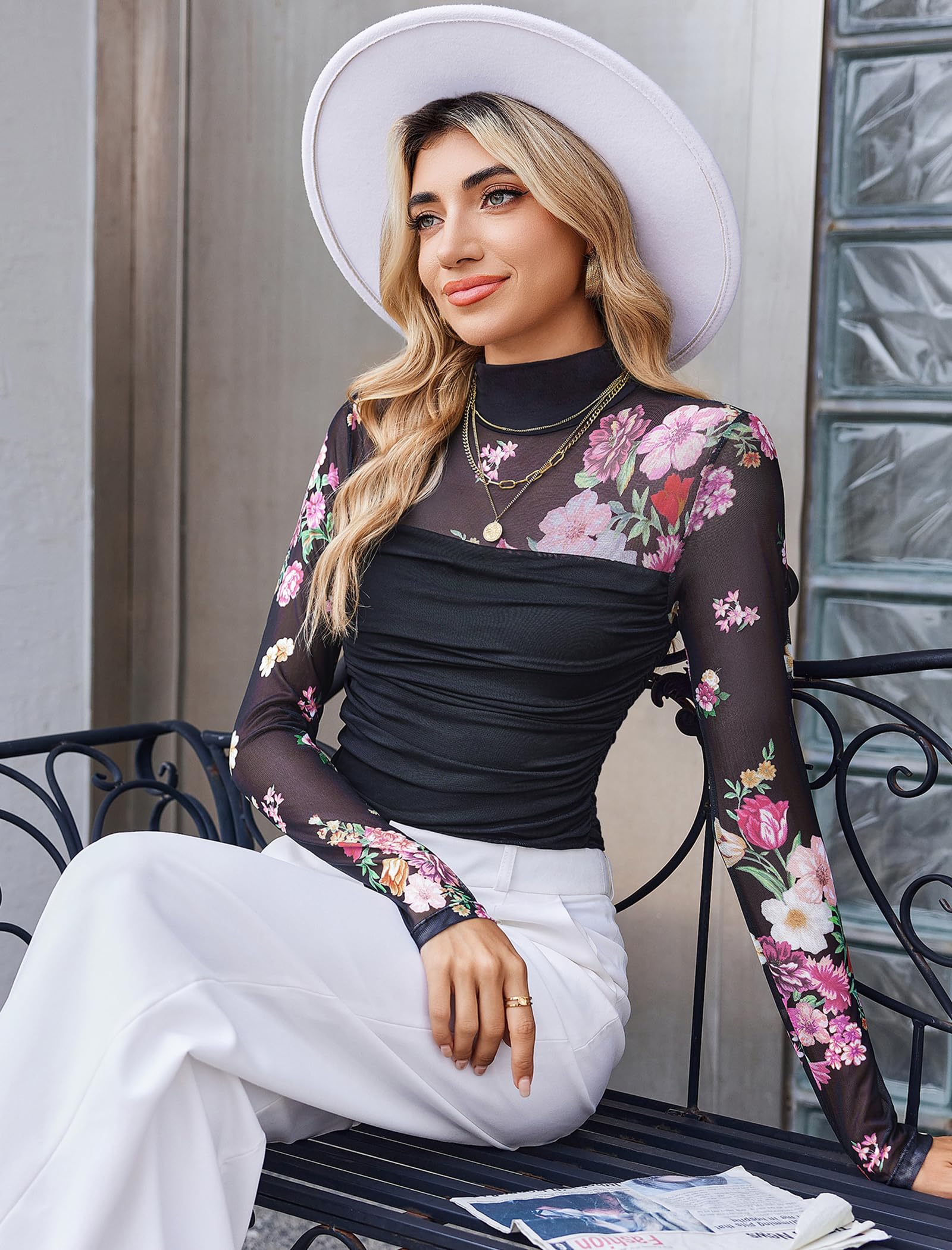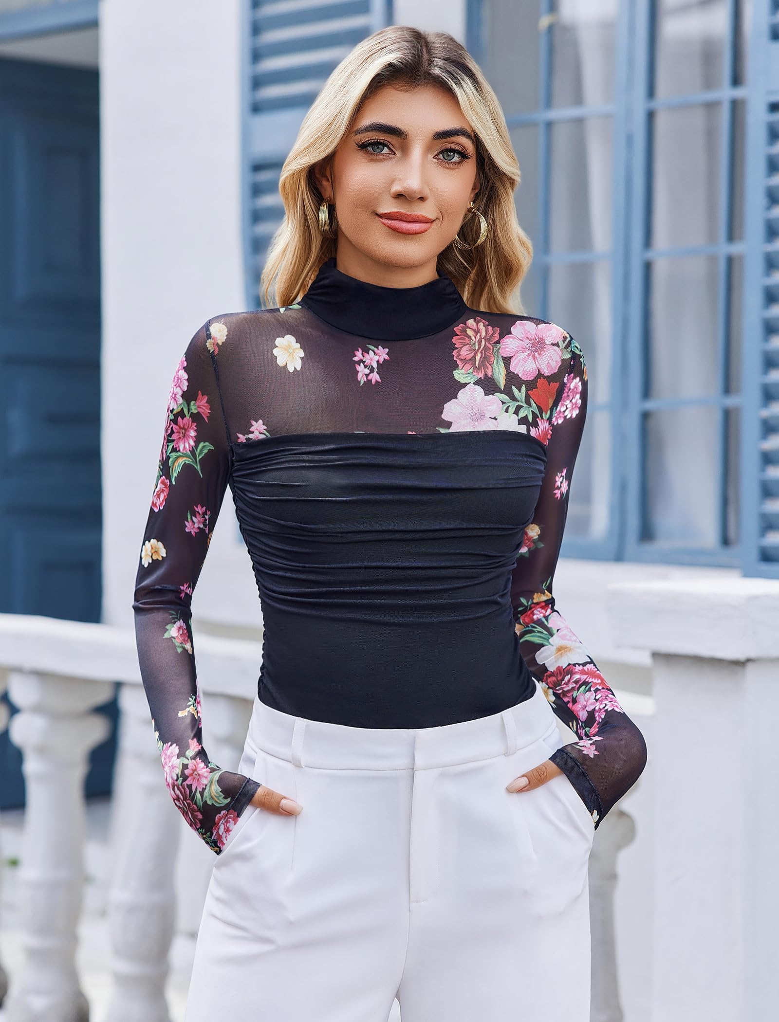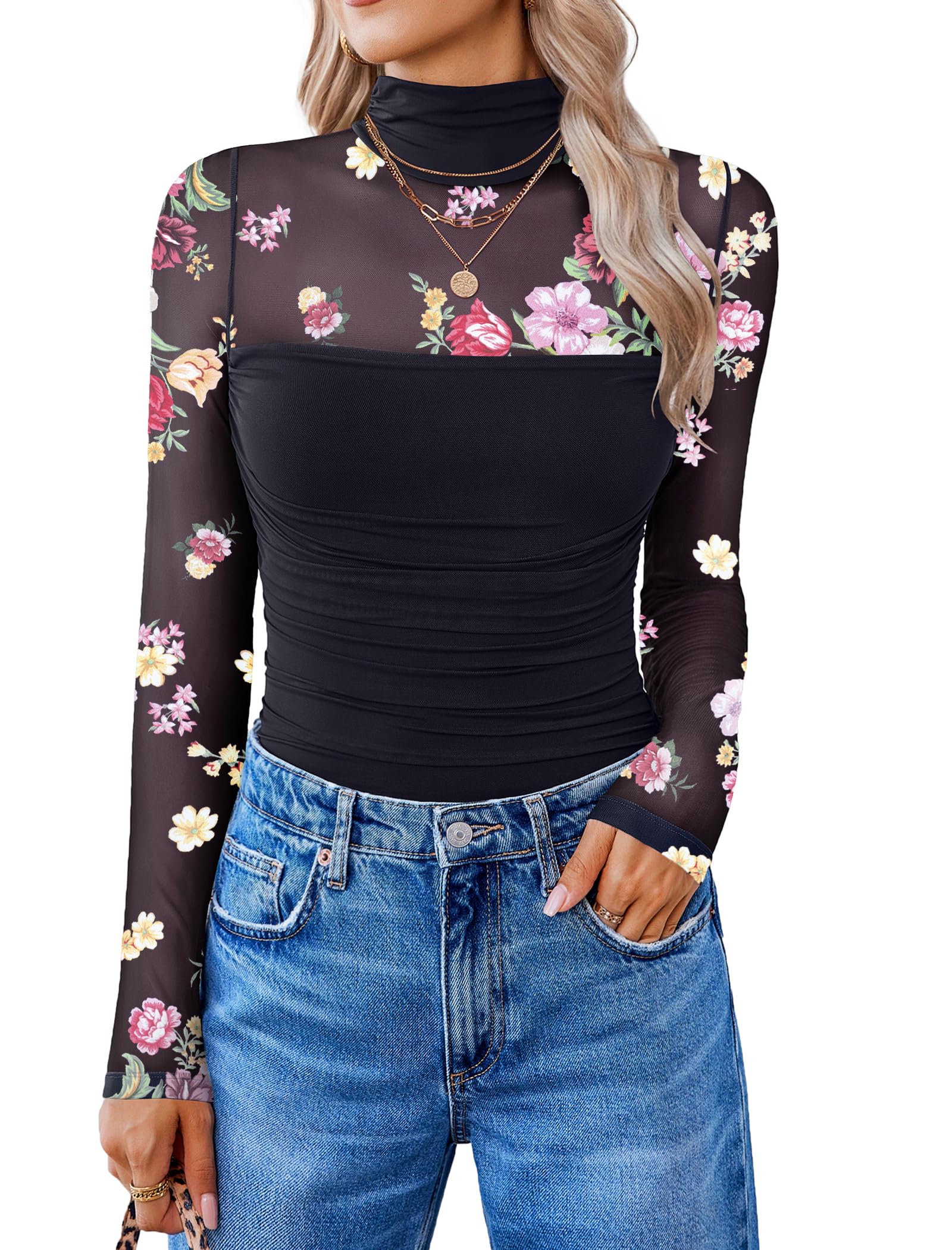 【Design】Sheer bodysuit for women feature Turtle neck and mesh sleeves ,design with double-layer fabric, layered ruched decoration,from chest to waist with super soft material,make it more slim fitting, bring a sense of detail design to basic styles, but also make them more elegant and versatile,great staple for your wardrobe.