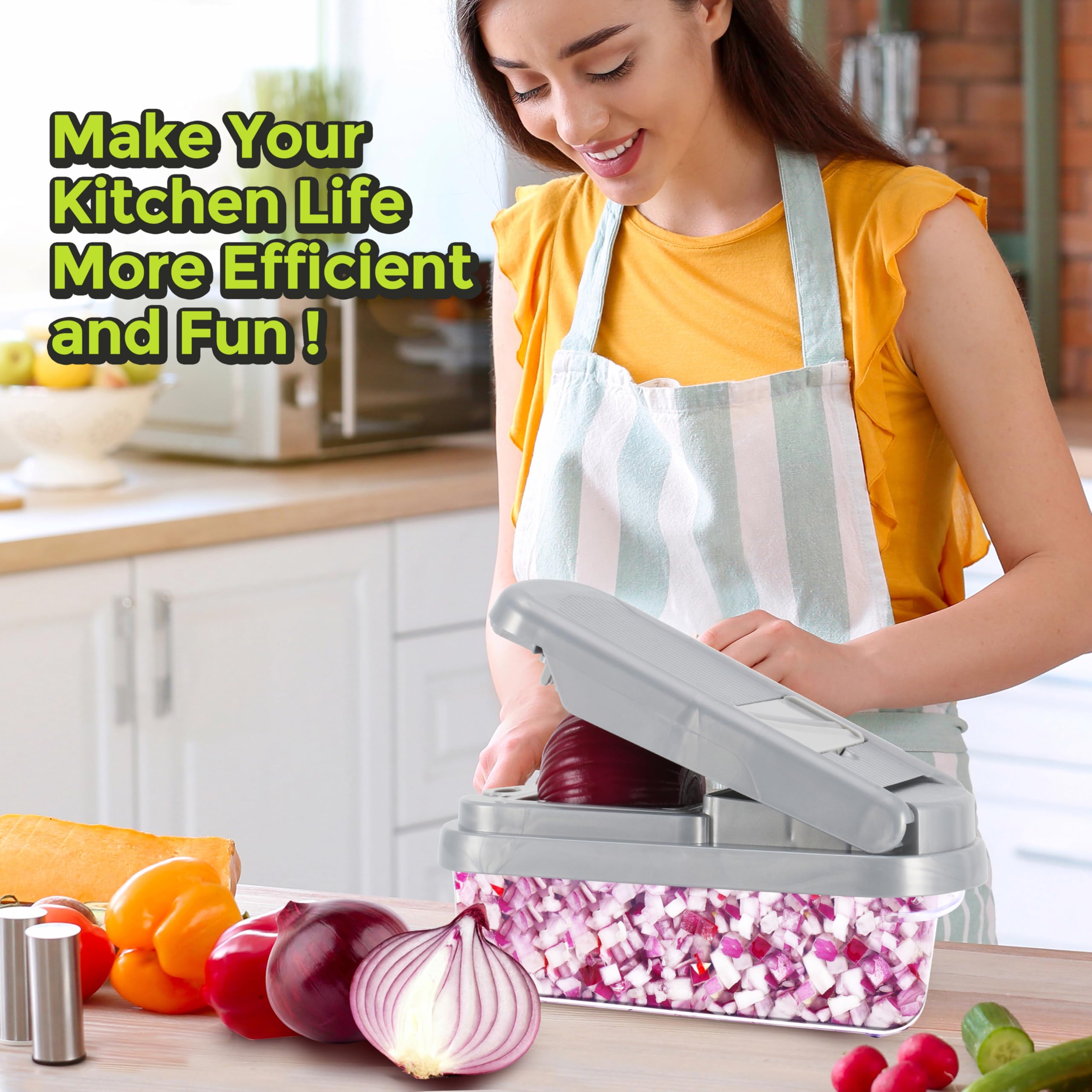 【SAVE TIME AND IMPROVE YOUR QUALITY OF LIFE】Designed to reduce preparation time, this Vegetable Chopper makes slicing labor-efficient. Easily dice tomatoes, peppers, carrots, beets, cucumbers, onions, and garlic in no time—ideal for anyone wanting more quality family time without sacrificing nutrition. Perfect for wives, mothers or cooking enthusiasts