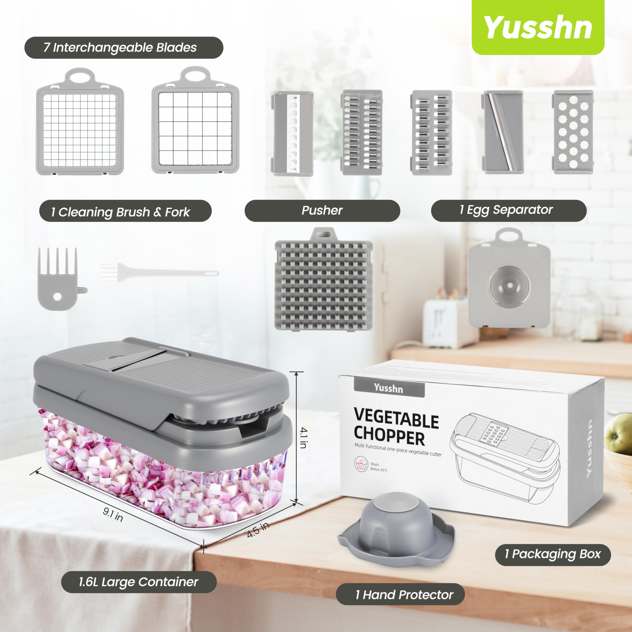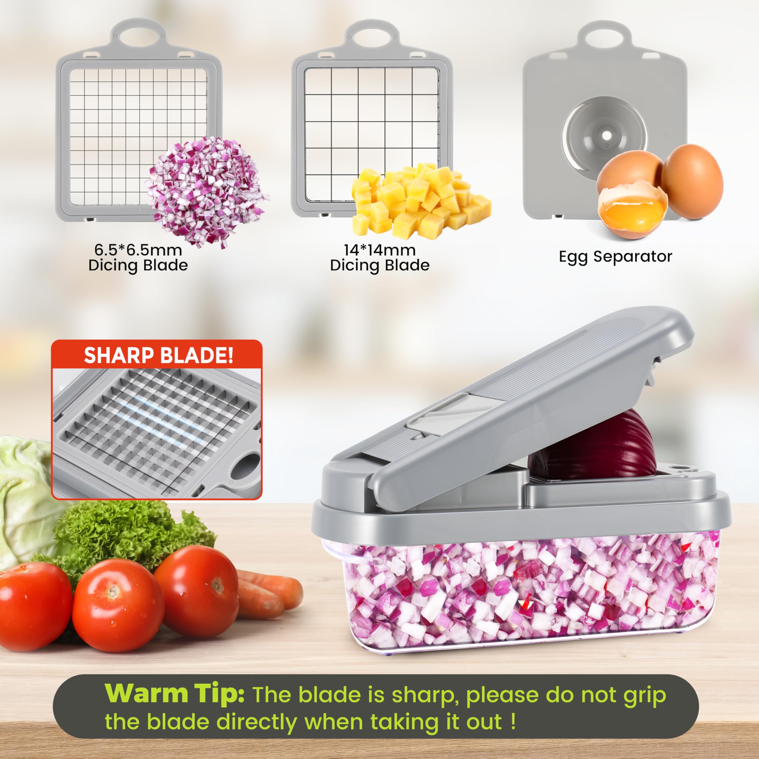 【12-IN-1 KITCHEN ACCESSORIES】This vegetable cutting kit includes: 1 cleaning brush; 1 hand protector; 1 egg separator; dicing blades (2*14x14mm and 6.5x6.5mm); grits cheese chopper; wave slicer;cheese grater (4mm); fine mill (3mm); slicer. If the item is relatively hard or large, it is recommended to make an initial preliminary cut. Prior to using this product, please ensure that it has been divided into smaller pieces for optimal results.