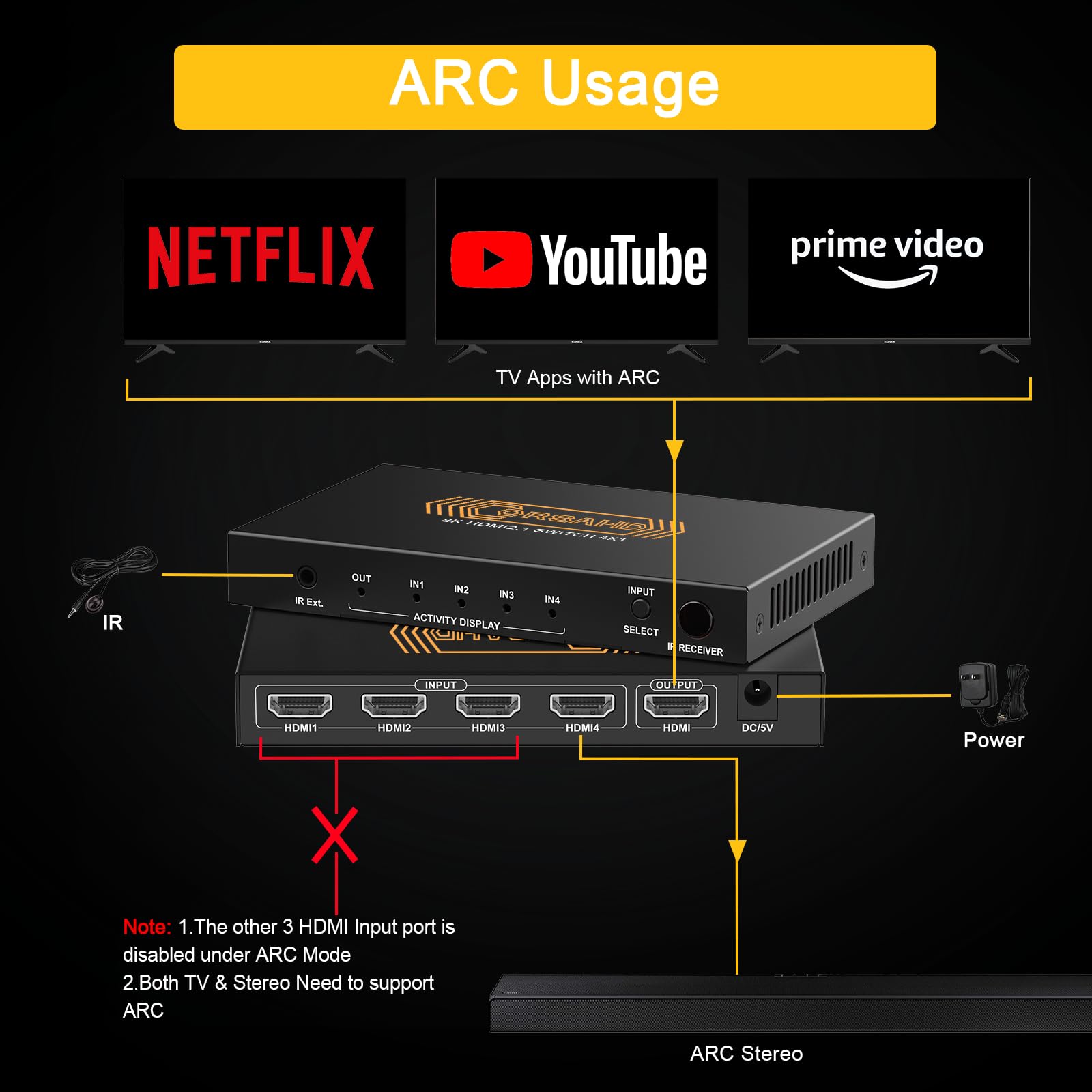 ✨【Please Note】 -- Highly recommend qualified HDMI 2.1 cable less than 10ft / 3m. Supports only 4 in 1 out, does NOT support 1 in 4 out or “Bi-directional”. Does Not support automatic switch.