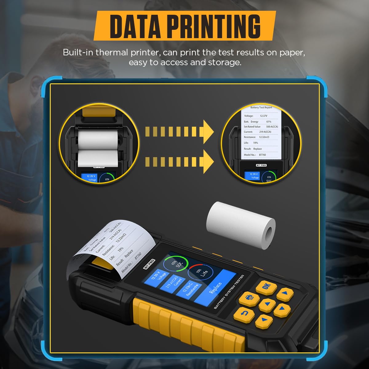 【Color Display and One-Touch Printing】The built-in thermal printer generates diagnostic receipts within seconds—effortlessly shareable with customers at one press. View critical data intuitively through its vivid screen and optimized interface design