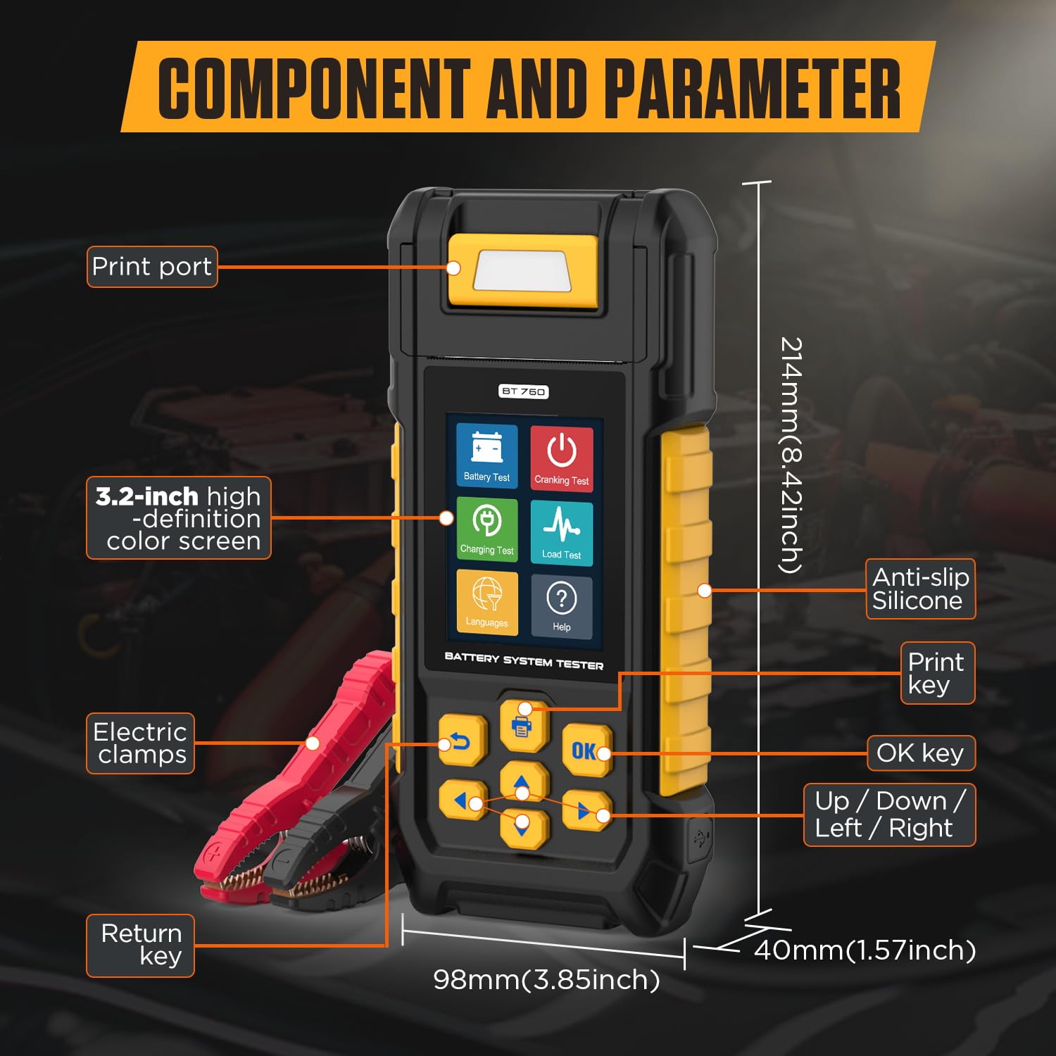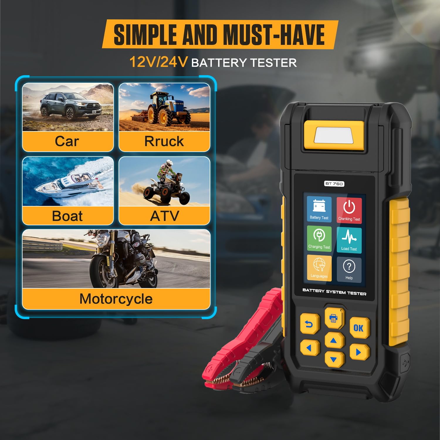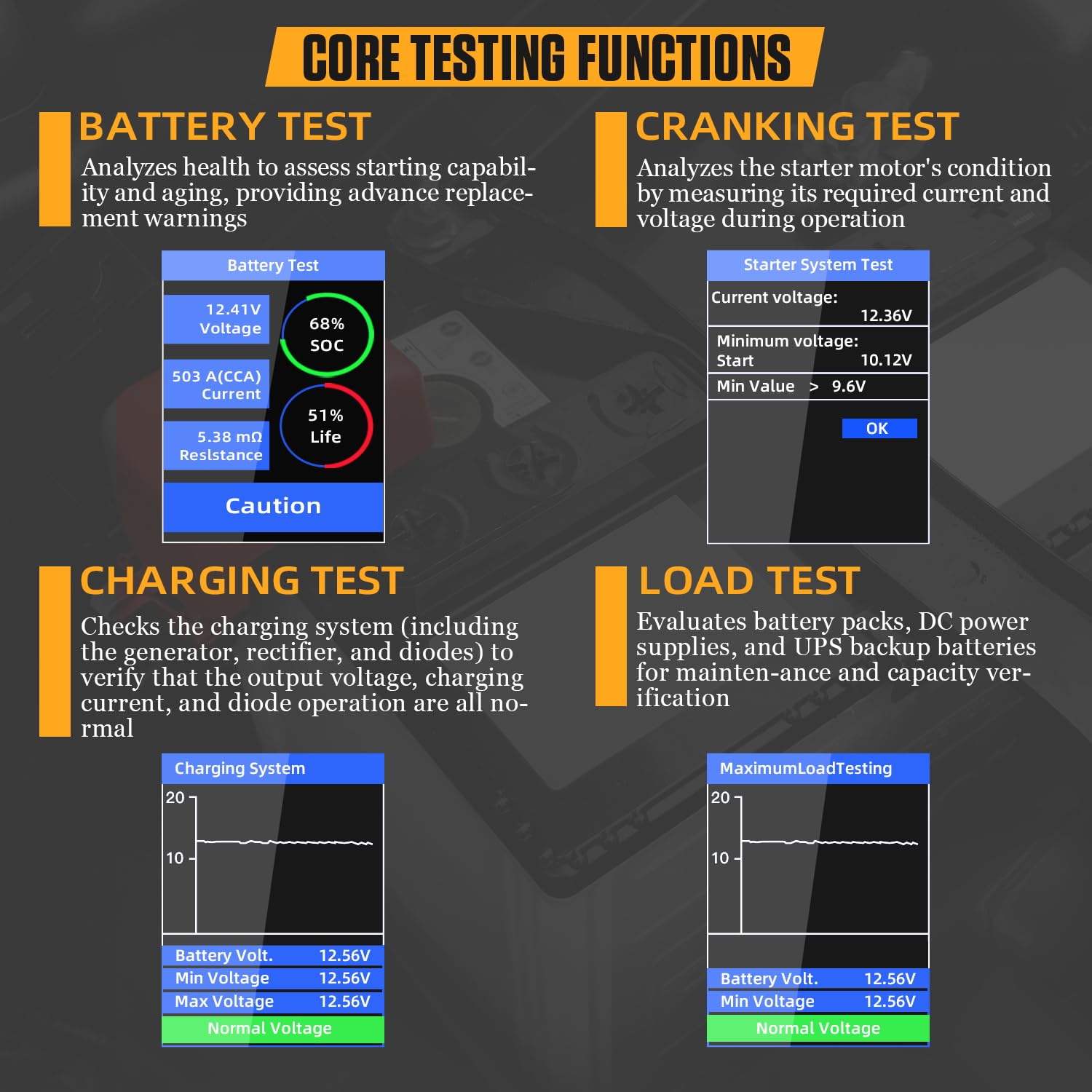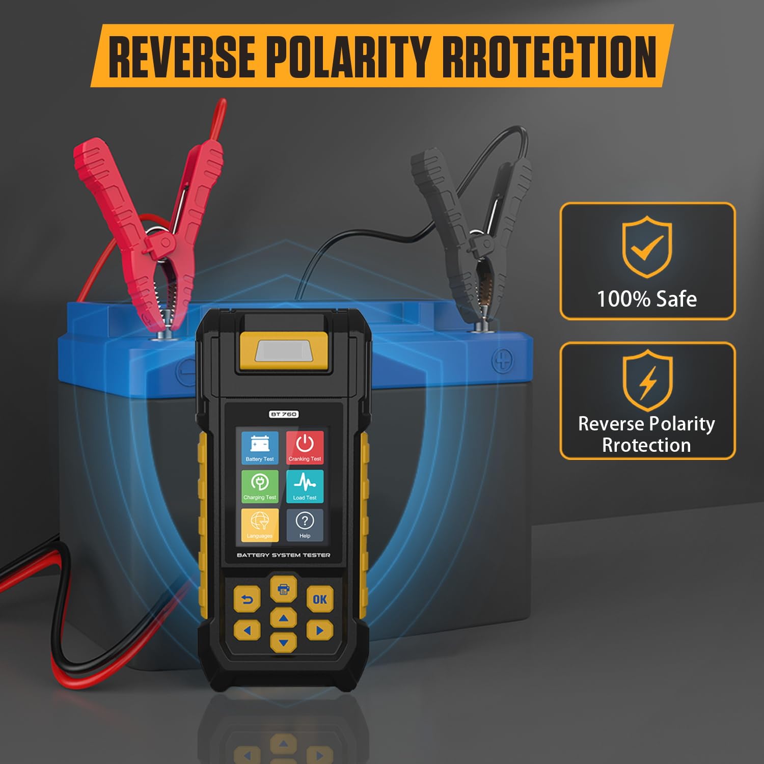【Extensive Application & Safety】Test standards include most battery standards in the world, CCA IEC EN DIN JIS, and OTHER SPECIES. Super wide range pro tester rated from 30to 2000 CCA. Compatible with cars, motorcycles, trucks, RVs, ATVs, SUVs, boats, yachts, mowers and even golf carts. Polarity reverse protection ensures that neither the battery nor the device gets damaged