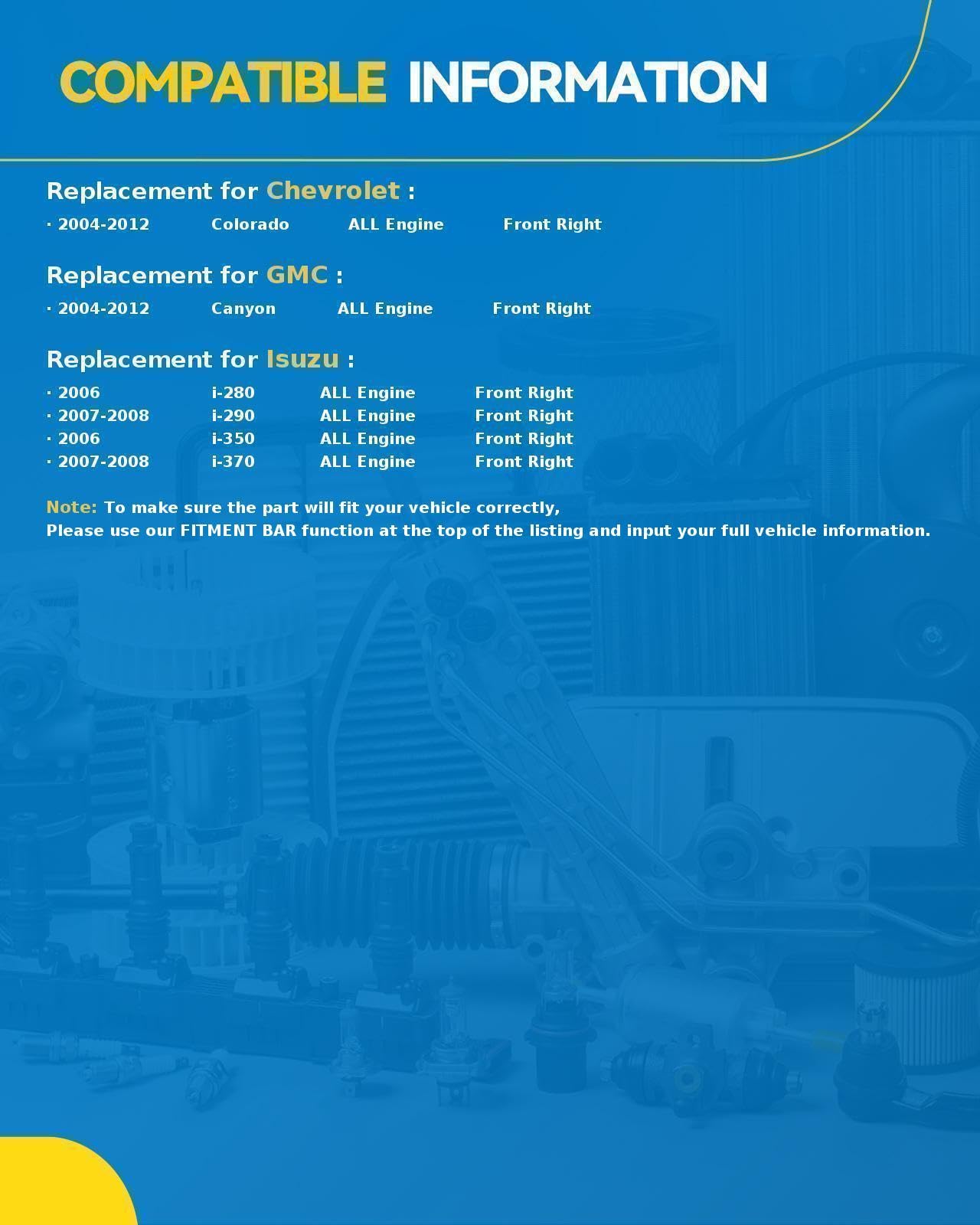 Vehicle Fitment:Window Regulator and Motor Assembly compatible with Chevrolet 2004-2012 Colorado GMC 2004-2012 Canyon Isuzu 2006 i-280/i-350 2007-2008 i-290/i-370.Please MATCH your vehicle on the left top before purchasing