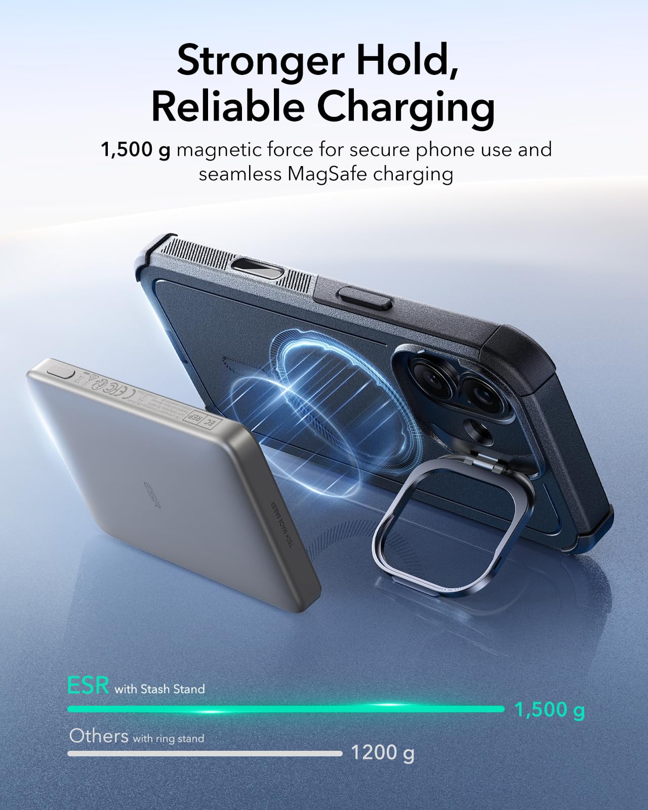 Stronger Magnetic Lock: powerful ring of magnets with 1,500 g of holding force enables faster, easier place-and-go wireless charging and a secure lock on any MagSafe accessory