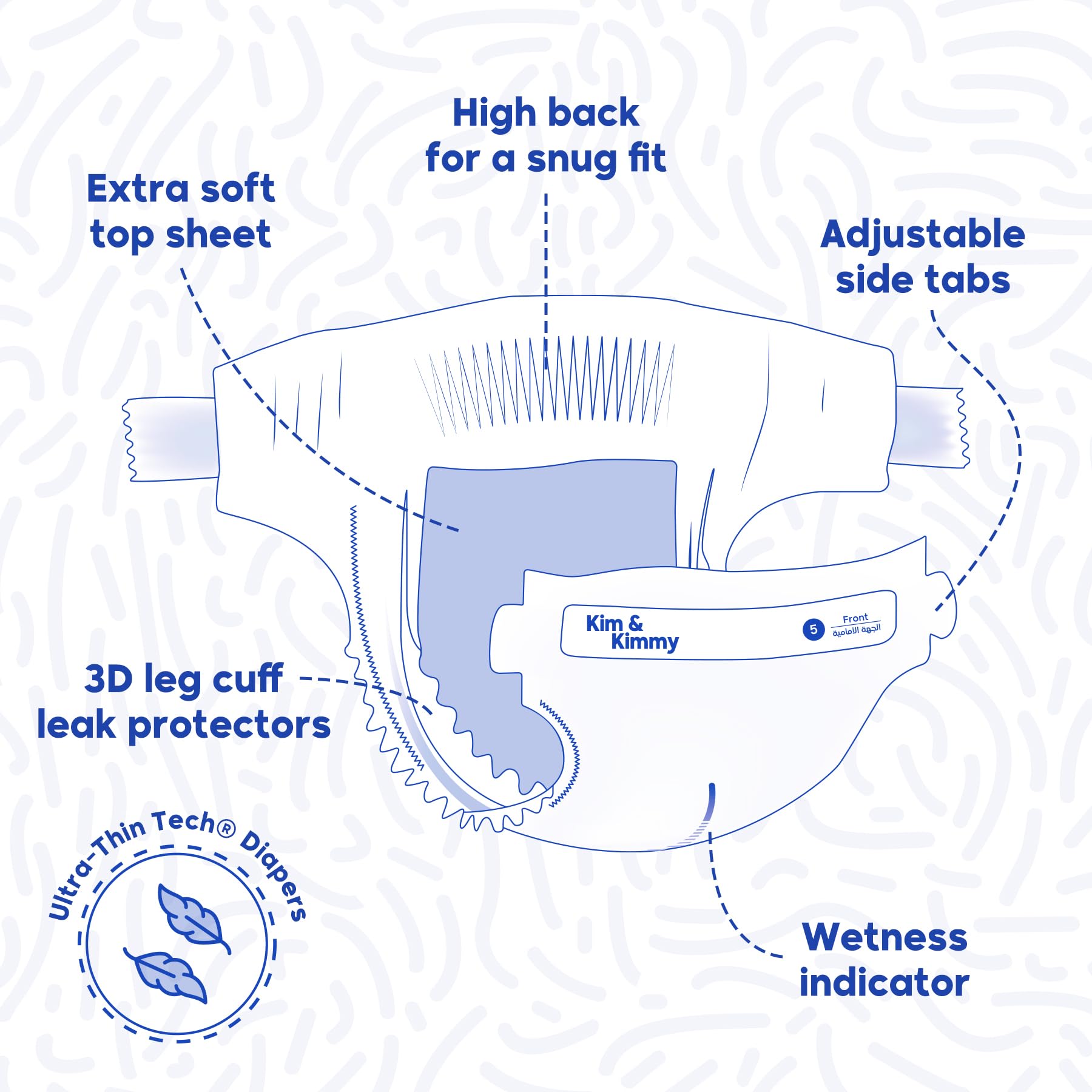 NO LEAKS! 12-HOUR LEAKPROOF PROTECTION - Kim & Kimmy diapers guarantee up to 12 hours of leak-free protection. Our 3D magic leg-cuffs ensure maximum absorption with absolutely no leaking, so you and your baby can enjoy a stress-free night.