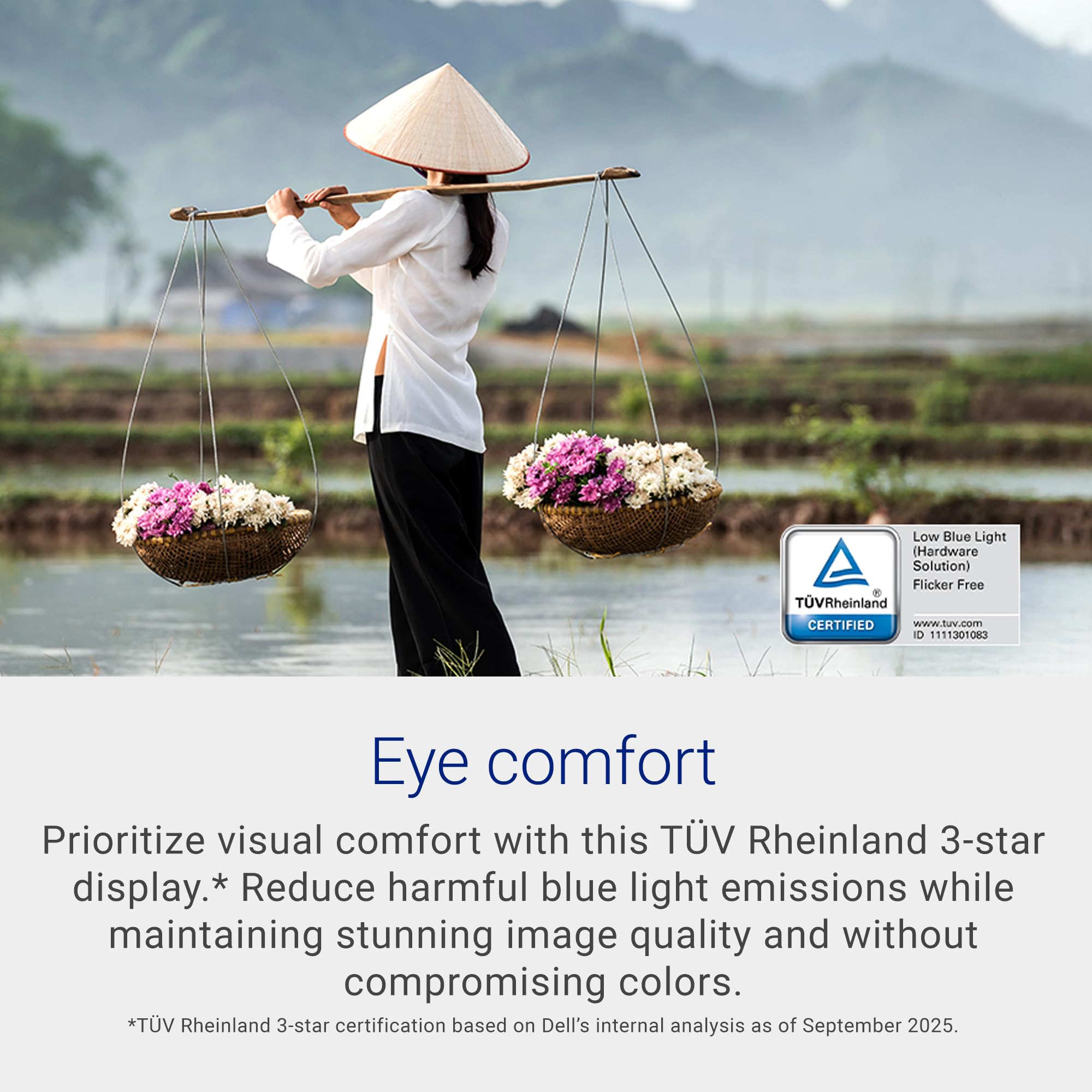 Eye comfort: TÜV Rheinland 3‑star certified display lowers blue light while preserving color quality.