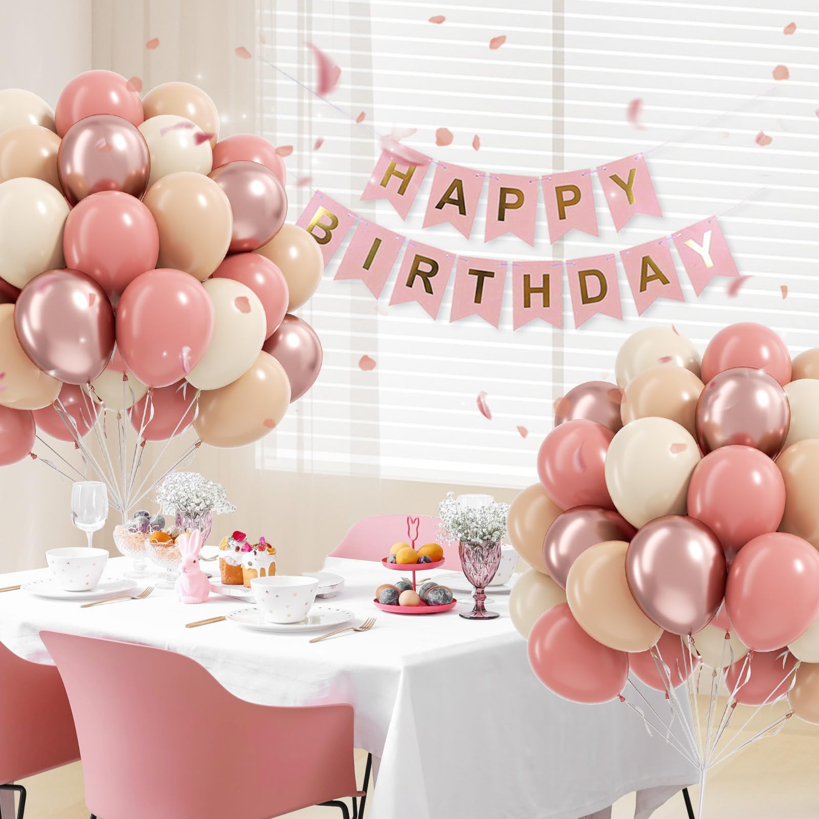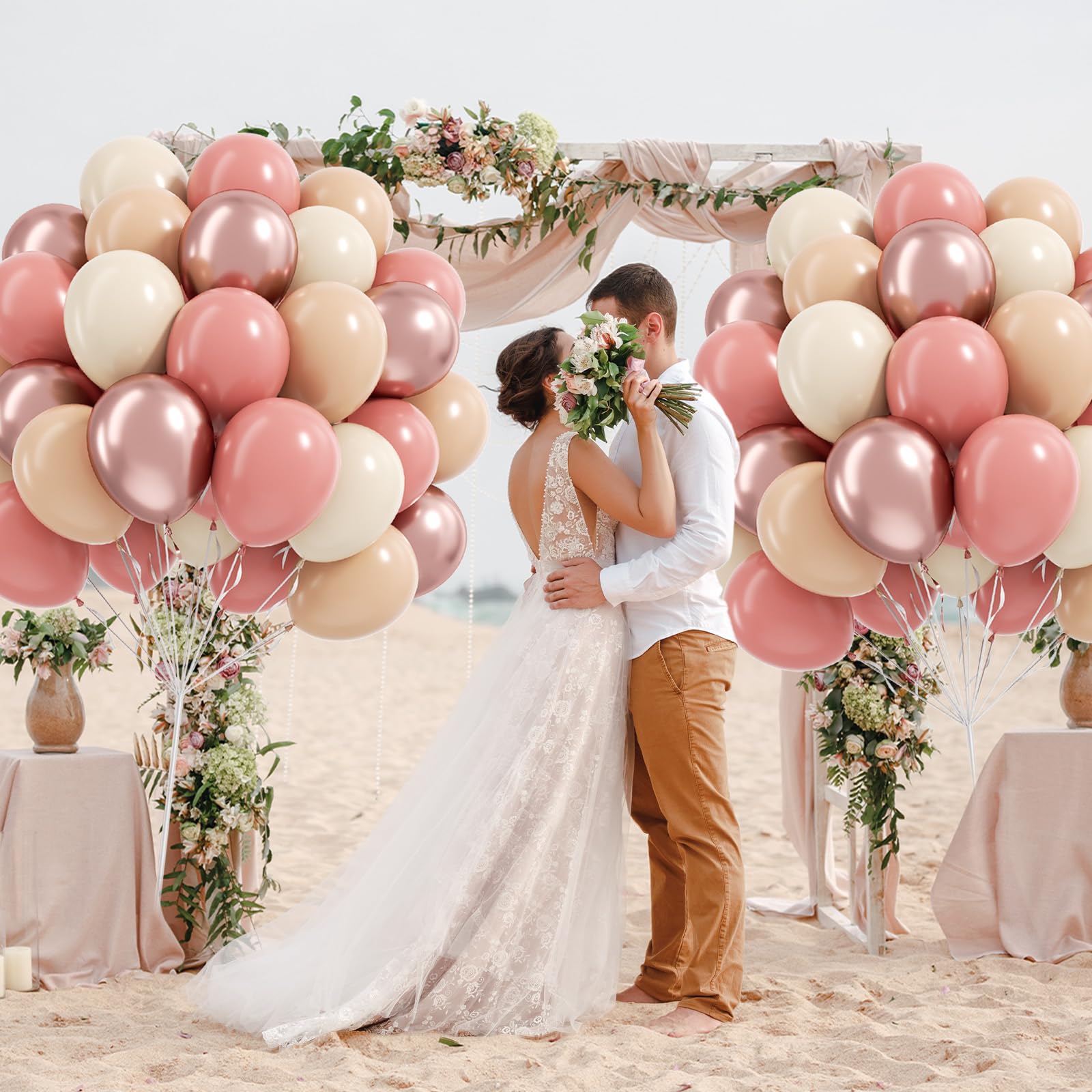 Package Include: 12inch dusty pink balloonsx20, nude balloonsx15, ivory white balloonsx15, 10inch metallic rose gold balloonsx10, white ribbonx1, glue dotsx20