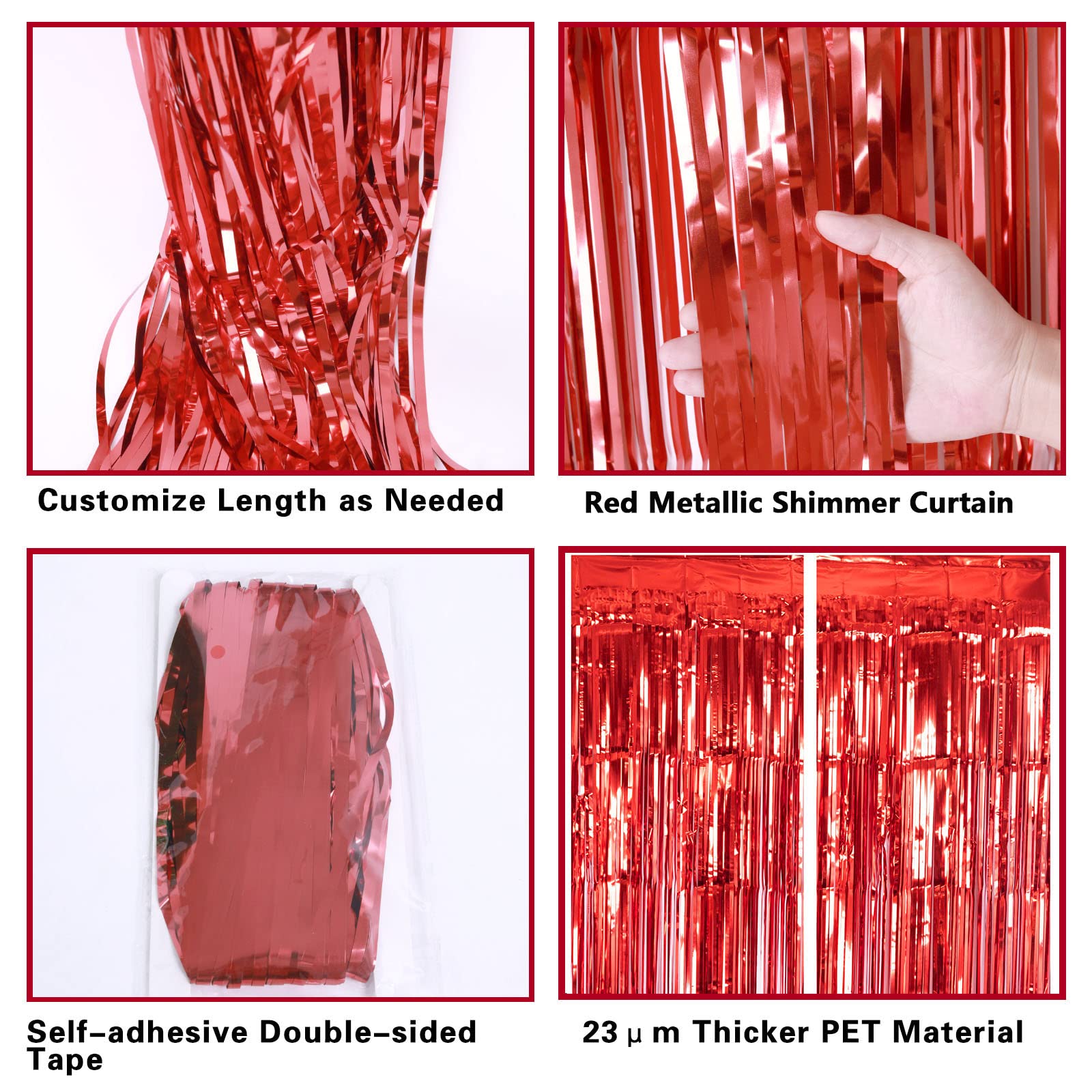 【Packaging】Includes 2 packs shiny red foil fringe curtains, each streamer size is 3.2ft x 8.2ft. With this shimmer tinsel backdrop curtain, you can make a beautiful entrance door curtain or a photo booth backdrop for your guests. They are perfect for christmas party.