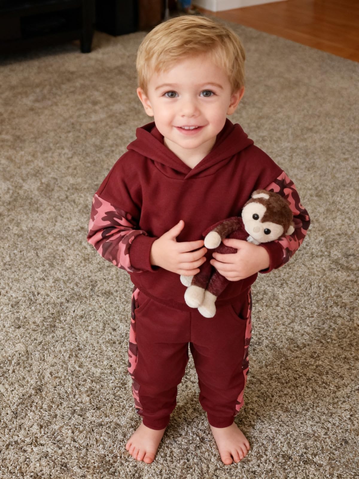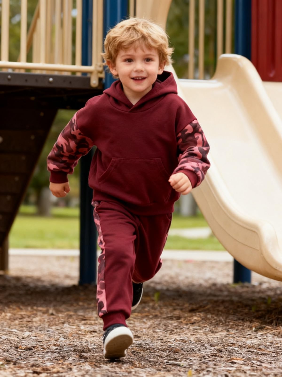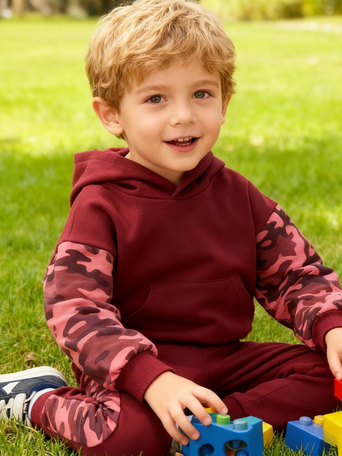 ashion Camo Color Block Design: Hooded sweatshirt and jogger pants feature matching camo color block, cute and stylish—meets "FASHION CUTE" style, making boys stand out in casual occasions.