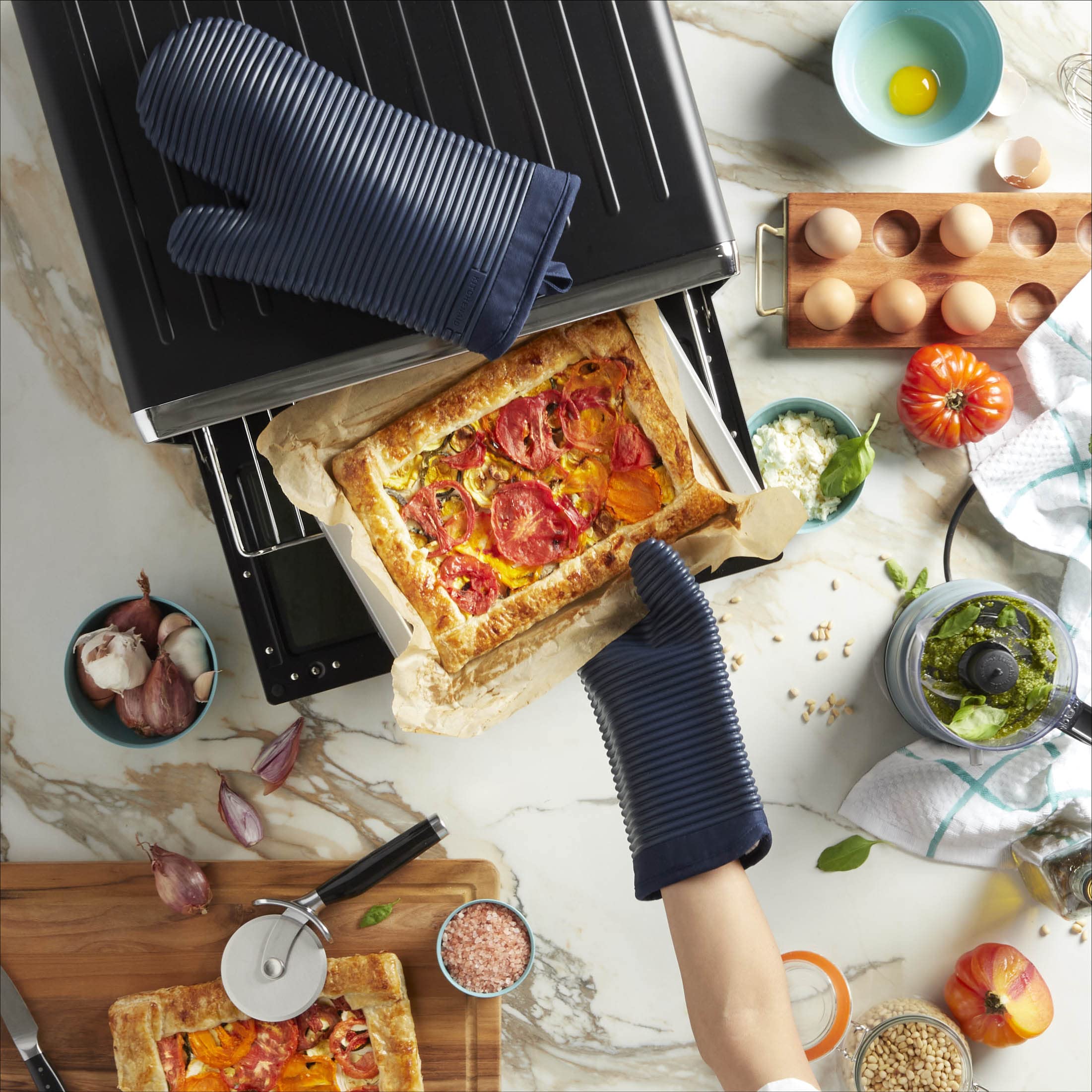 Perform your kitchen tasks safely with the KitchenAid Ribbed Soft Silicone 2-Piece Oven Mitt Set. The textured, ribbed stripe design offers a secure grip while handling hot objects. Made of durable and waterproof silicone with a cotton cuff that provides additional shield from the heat and polyester lining that offers comfort and insulation. Each oven mitt measures 7.5 inches by 13 inches for a generous fit. They are heat resistant up to 500 degrees Fahrenheit. Coordinate these oven mitts with coordinating KitchenAid Ribbed Soft Silicone Pot Holders for a complete set.