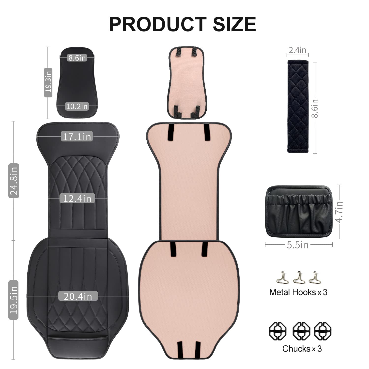 Package Includes:car seat cover*1, car pocket organizer*1,car seat belt pad*1,metal hook*3, chuck*3,installation manual * 1.Please contact us if you have any questions about the product, and we will reply you within 24 hours.