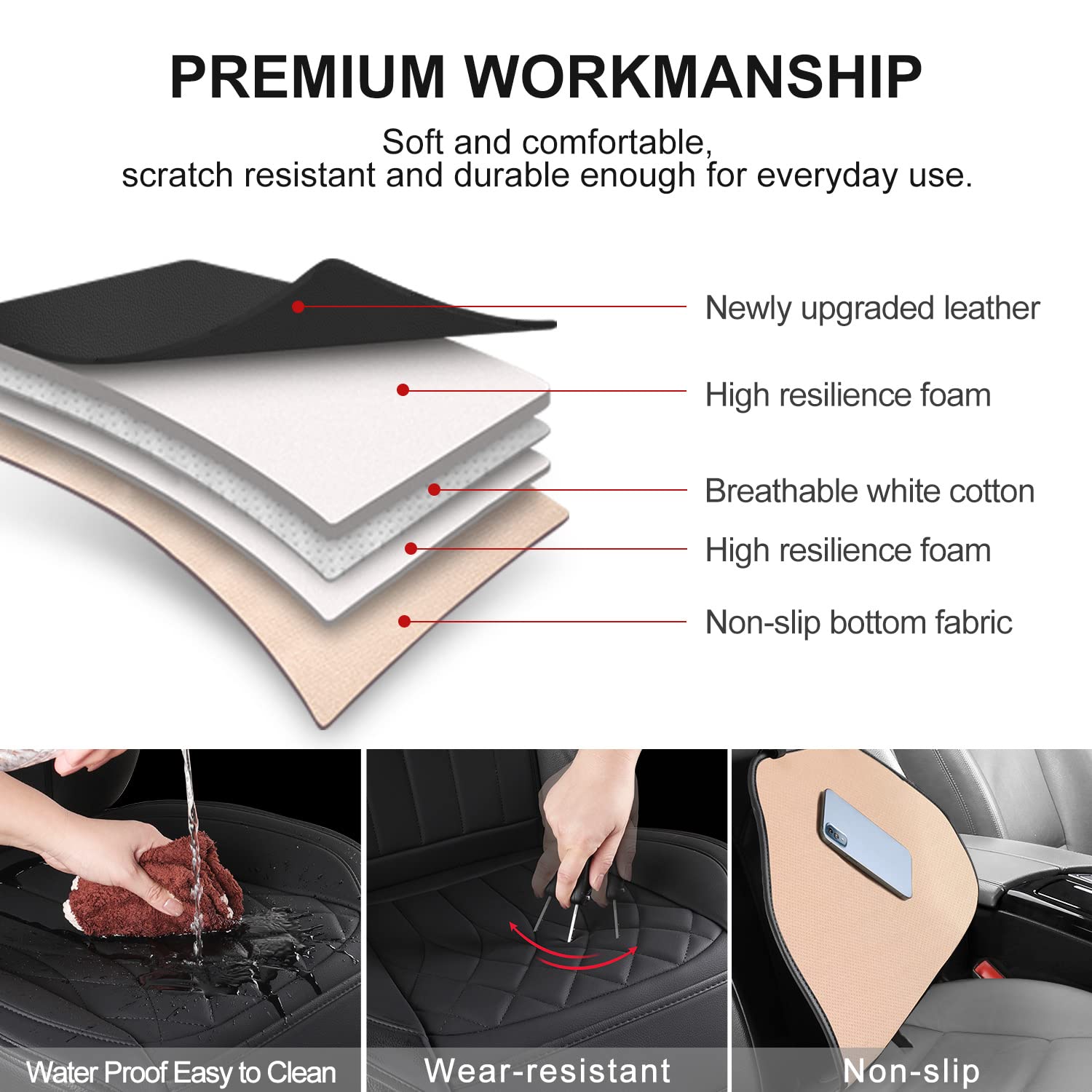 Leather Soft & Comfortable: The 1 Pack leather front seat cover is wear-resistant, scratch-resistant, waterproof, and easy to clean. Rebound composite material is soft in touch, creating top resilience for maximum comfort during your drive. The non-slip backing ensures that the front seat cover stays in place. It's easy to care for and clean with a wet soft towel.