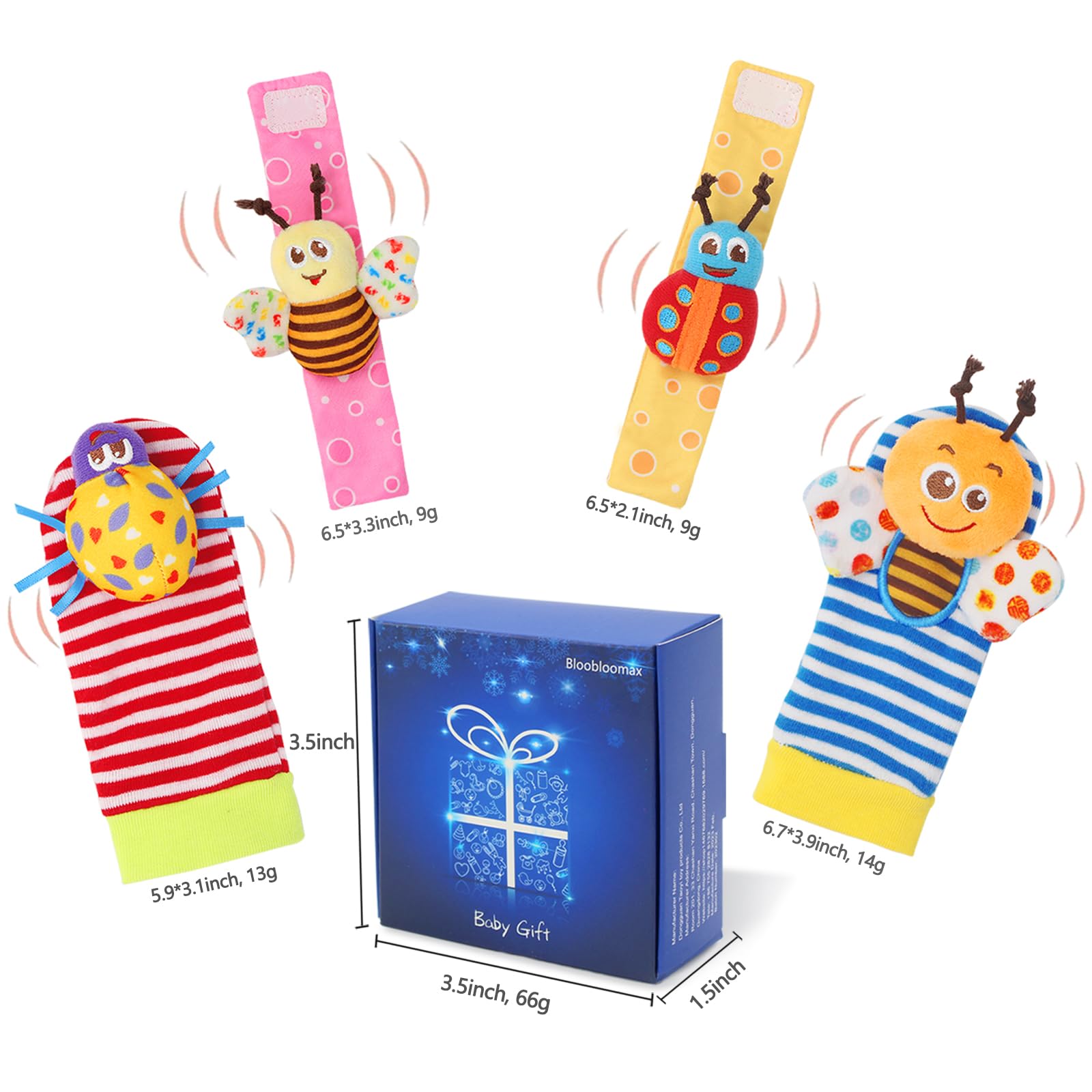 CUTE DESIGN -- All Wrist Rattles and Foot finder socks have bells inside, the Wrists rattles attach with fabric hook, easy to put on and take off. The wings of Bee and Butterfly were with sound paper, encourage baby to reach and grab.