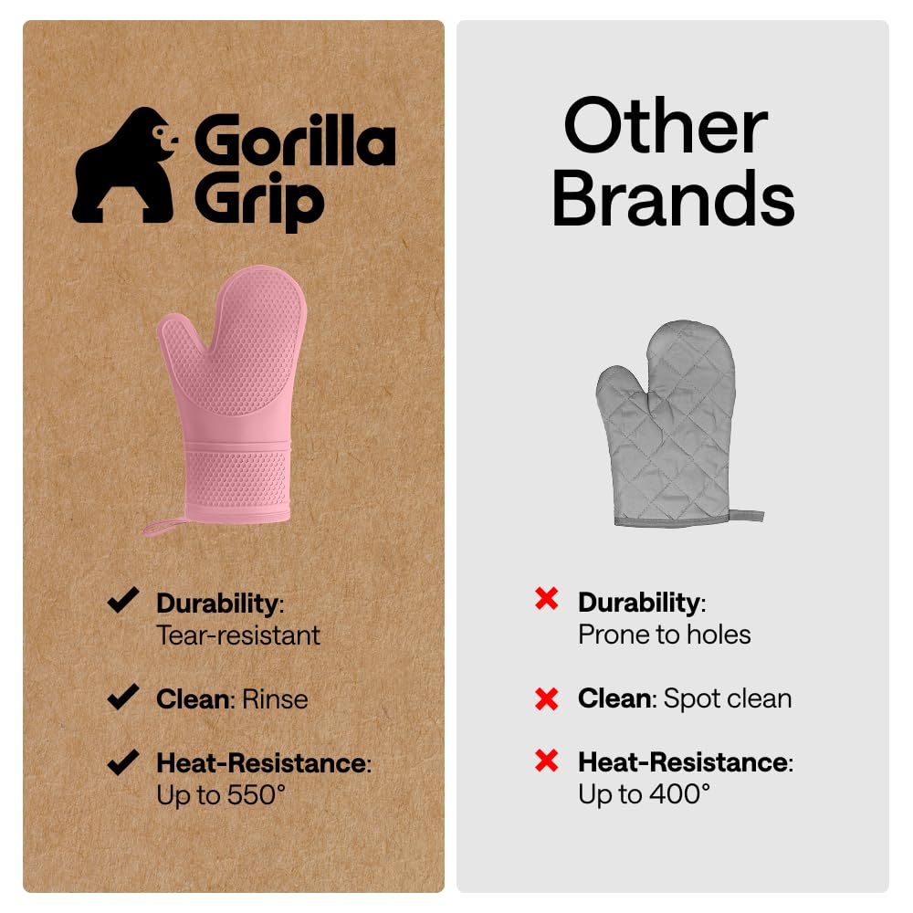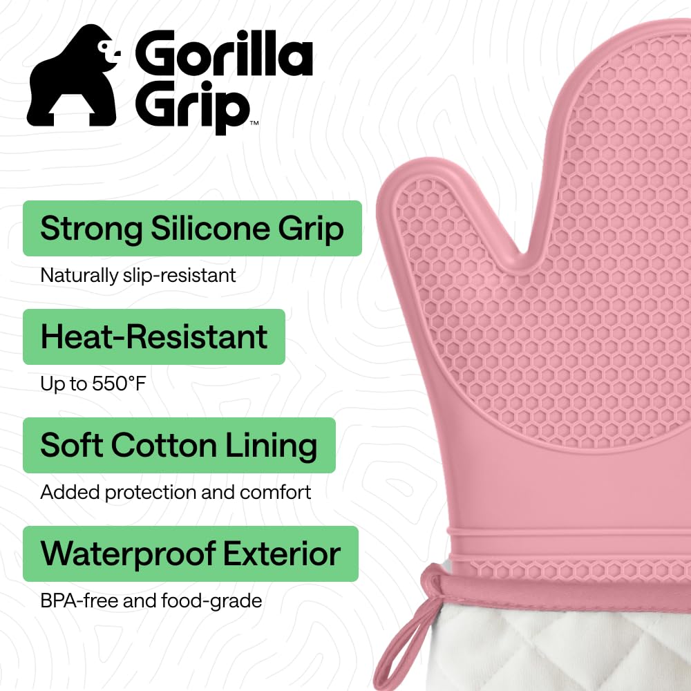 WATERPROOF AND STAIN RESISTANT: no more constantly stained oven mitts; Gorilla Grip Silicone Mitts are both stain resistant and waterproof; spills can easily and instantly be rinsed away under water; hot liquids won’t soak through and scald your skin as they would with other materials