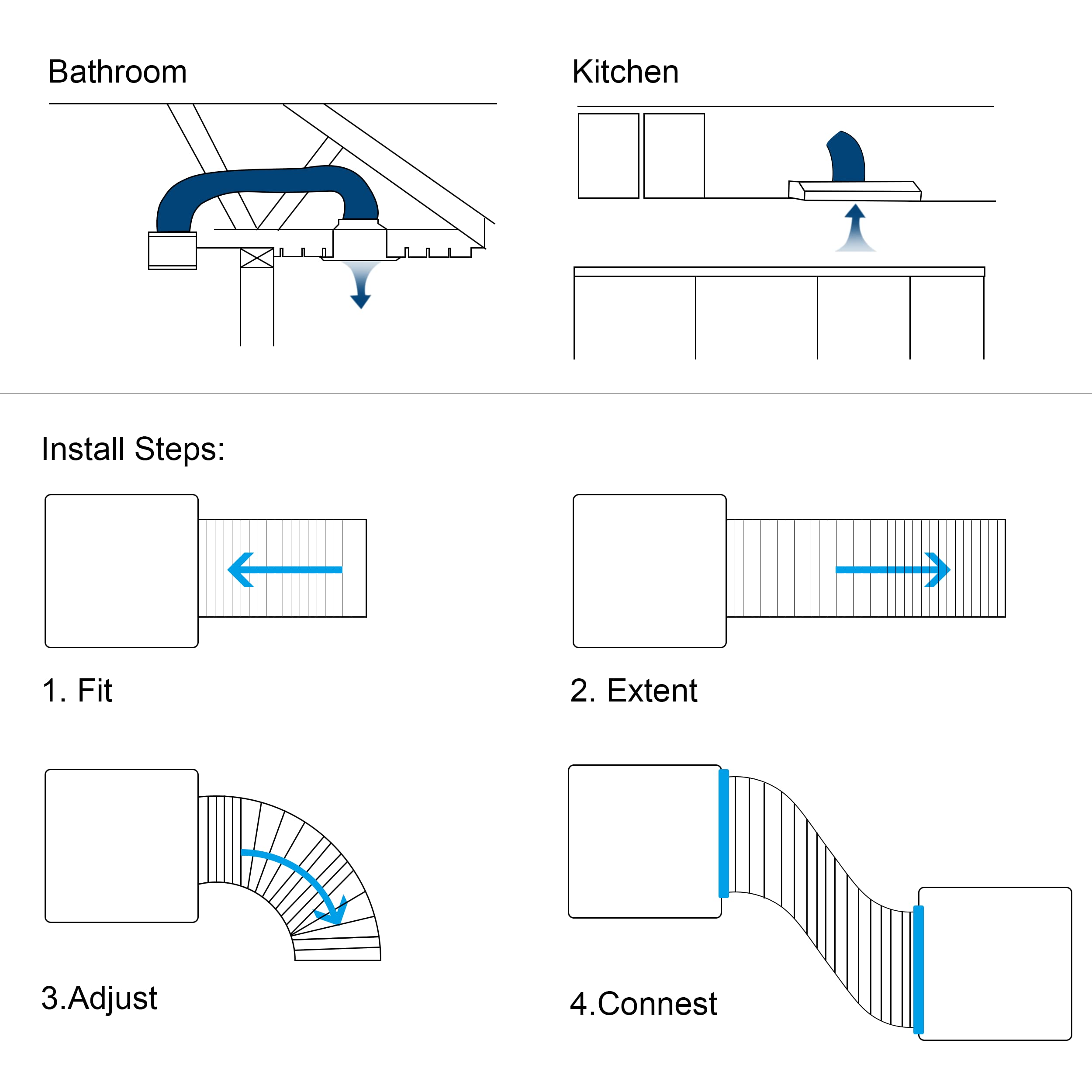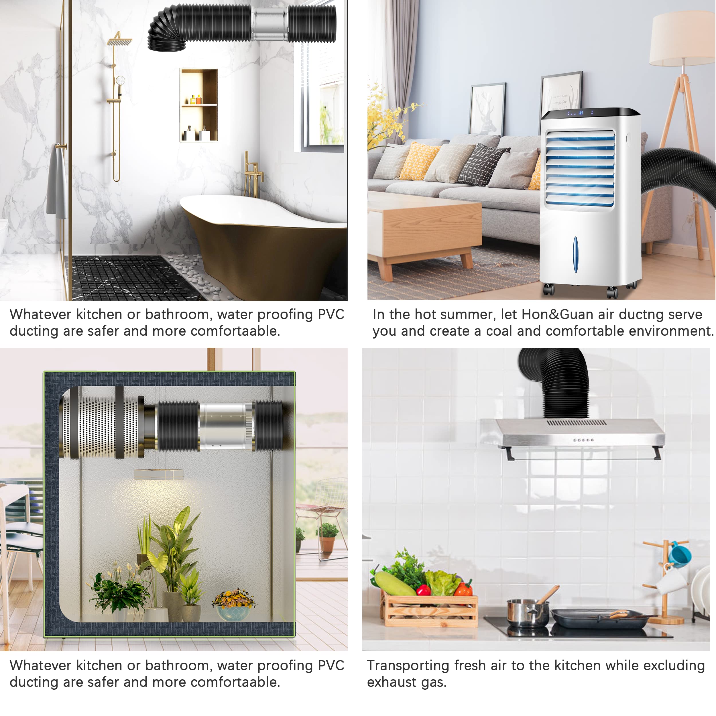 Variety of Applications: Hon&Guan Ducting Is suitable for HVAC system. It will move and deliver air in Kitchens (cooking exhaust), Green Houses and Grow Rooms (Air Circulation, Intake, Exhaust and Light Fixture Cooling), Bathrooms (Smell and Moisture Exhaust), Dryer Rooms, Grow Tents and other applications etc