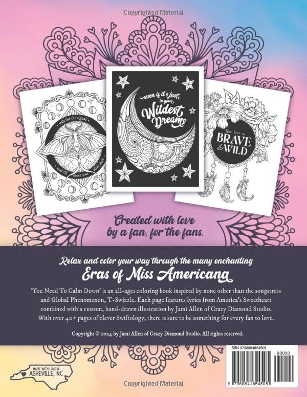 ✨ You Need To Calm Down & color your way through the many Enchanting Eras of Miss Americana! A perfect gift for the Taylor Eras Tour 2024 - Created with lots of love by a Swift fan, for the Swift fans! ‘You Need To Calm Down’ is an all-ages coloring book inspired by none other than the songstress, global phenomenon and The Queen of Pop, Taylor. Each page features lyrics from Tay-Tay, America’s Sweetheart, combined with a custom, hand-drawn illustration by Jami Allen of Crazy Diamond Studio and loosely flows through the Eras Tour setlist in order. The illustrations include nature-inspired patterns, mandalas, florals, sparkly designs, midnights, moon & stars, snakes, heart hands, luna moths, butterflies, cats, gems, bejeweled, guitars, dreamcatchers and more! With over 40+ pages of clever Swiftology, there is sure to be something for every fan to love and be inspired by. ✨ What's Inside: 🌙 Midnights, moon & stars 🐍 Snakes, luna moths & butterflies 💎 Gems, bejeweled patterns & floral mandalas 🍃 Nature-themed line art with a fierce, feminine vibe ✨ Perfect gift for all ages – teens, adults, and fans alike! ✨ Features of this book include: 45 Hand-Illustrated pages inspired by the music of Taylor A "This Book Belongs To" page to make it your own Moderately detailed illustrations that allow room for shading and blending colors Beautiful, silky matte cover Single sided pages on crisp white paper Black Bejeweled printing on the back side of each illustration 3 Color test pages 3 empty pages in the back for notes & doodles Reduces anxiety & depression Boosts mindfulness Moderate level of coloring difficulty ✨ Benefits of coloring: Stress Relief: Engaging in coloring can help reduce stress by allowing individuals to focus on the present moment and the repetitive motions involved in coloring. This can have a calming effect on the mind and body, promoting relaxation. Anxiety Reduction: Coloring has been shown to promote mindfulness, which is the practice of being fully present and engaged in the moment. This can help reduce anxiety by shifting attention away from worrisome thoughts and promoting a sense of calmness. ADHD Management: Coloring can serve as a form of structured and focused activity, which can be particularly beneficial for individuals with ADHD. It provides a task that requires attention and concentration, helping to improve focus and reduce impulsivity. Additionally, the repetitive nature of coloring can have a soothing effect and help regulate emotions.