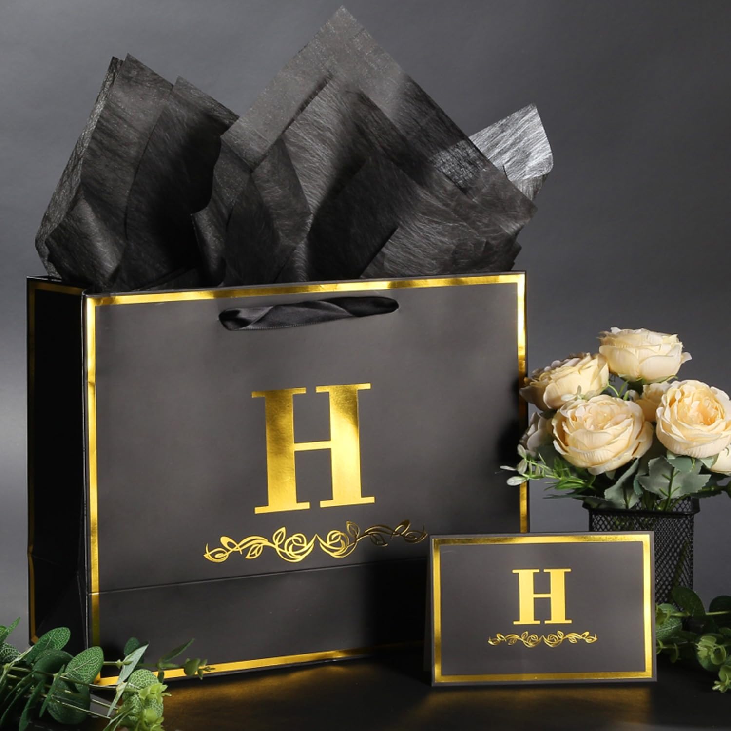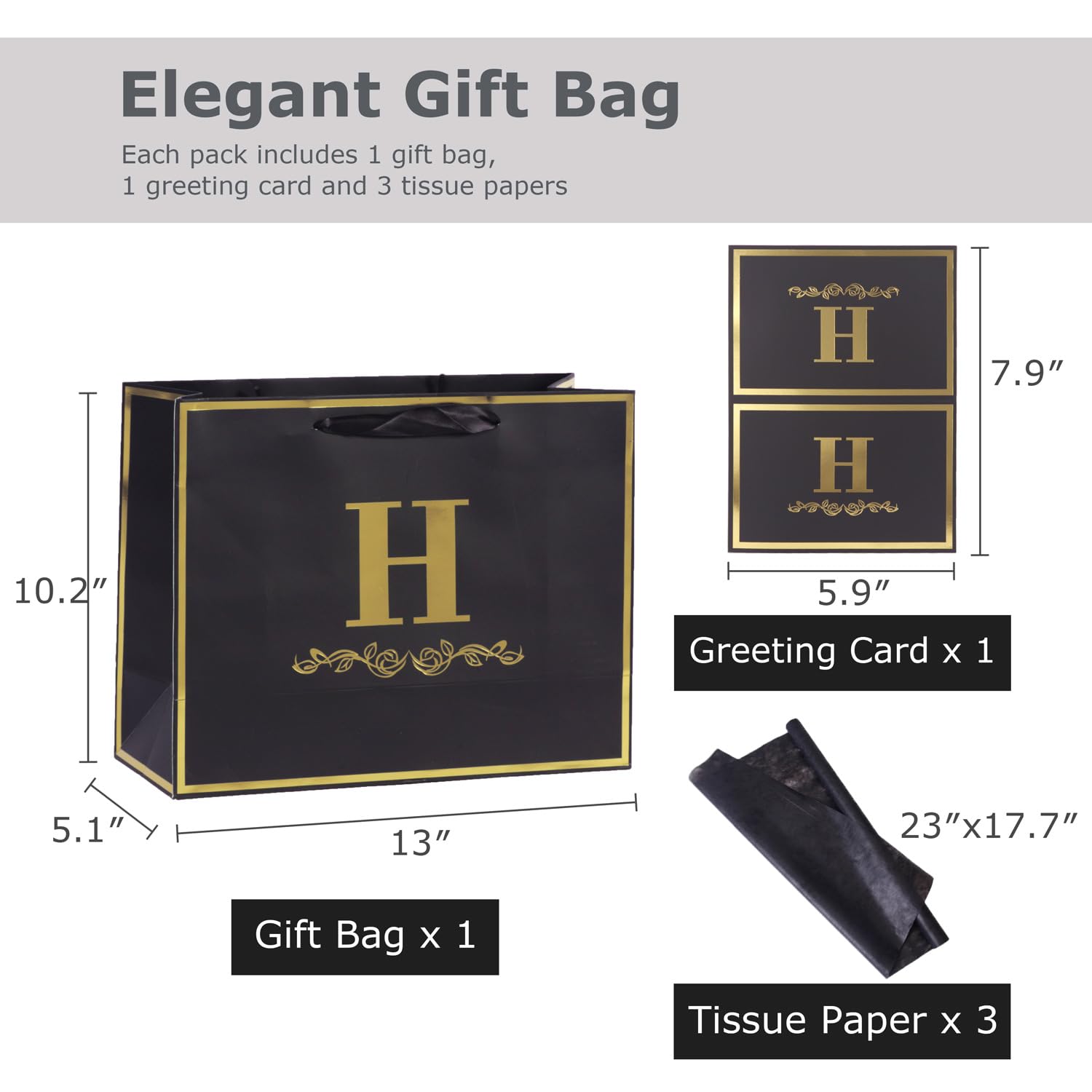 Alphabet Birthday Gift Bag with Card and Tissue Paper for Men Women, 13" Large Black Gold Personalized Horizontal Paper Bag for Gifts Wrapping - (Letter H)