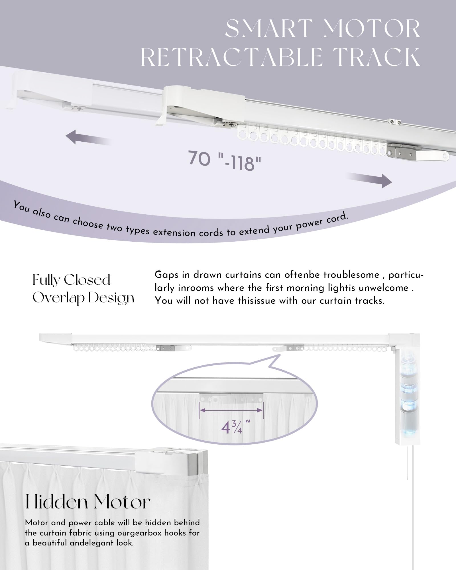 Retractable Smart Track: The high-quality aluminum track is adjustable from 70"-118", making it perfect fit for different usage scenario. Easy to install, more quiet and smooth when running. Just pull it and will open or close automatically. Free to operate manually during power-cut, no worries.