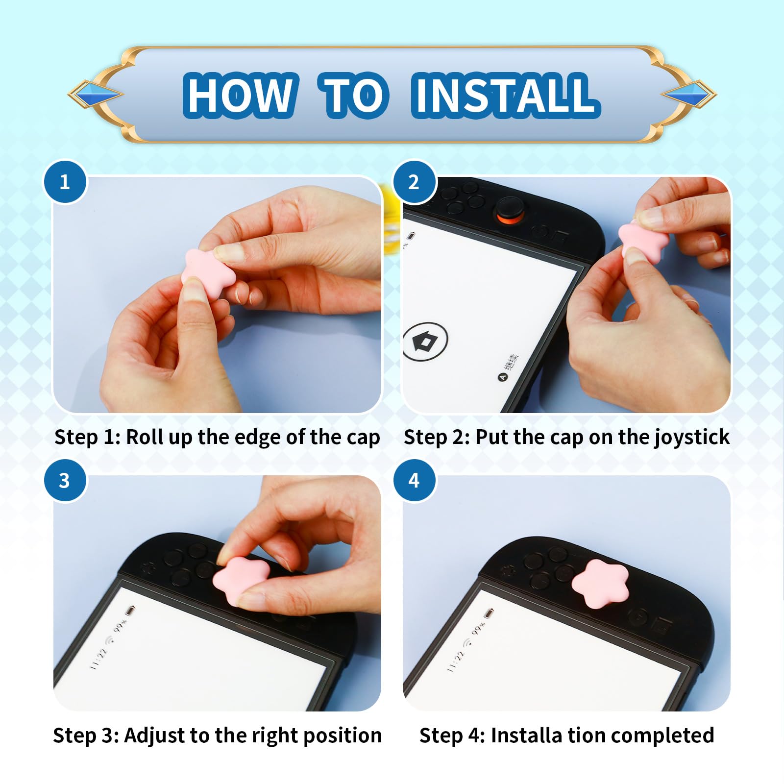 💗【Easy to Install 】① Turn over the joystick caps. ② Align on the joystick. ③ Fall the caps. Please note: Check if the caps wrap the joystick completely to prevent them from pop off when you playing.