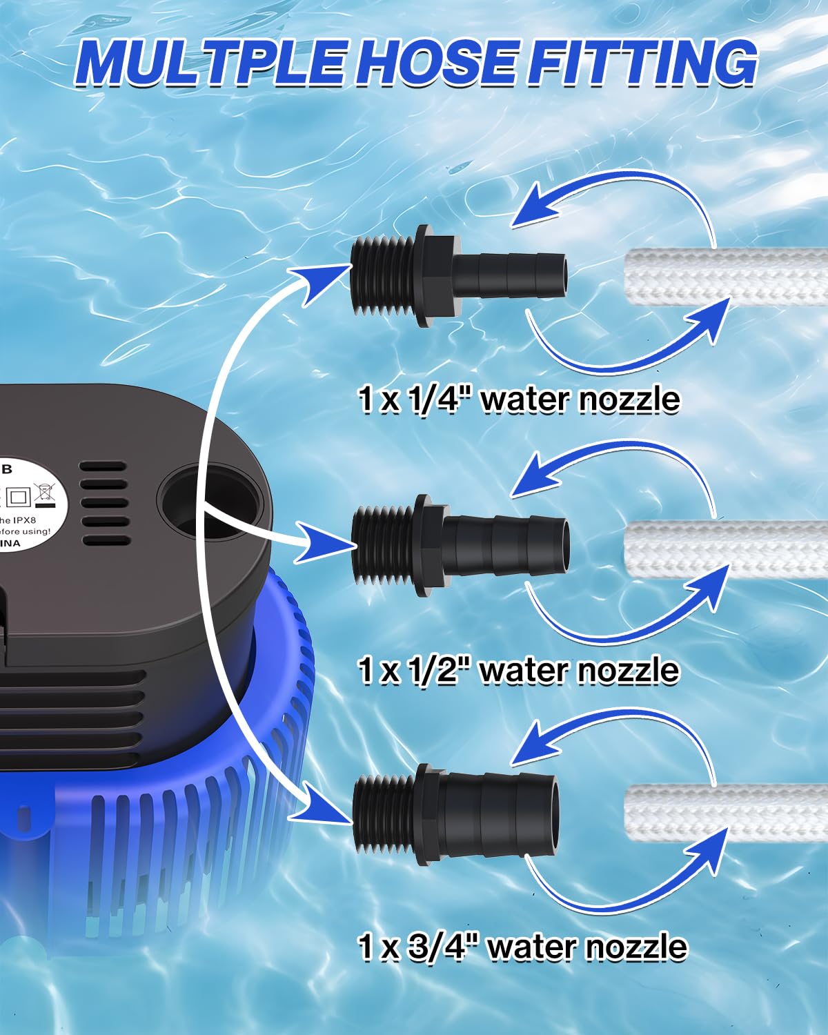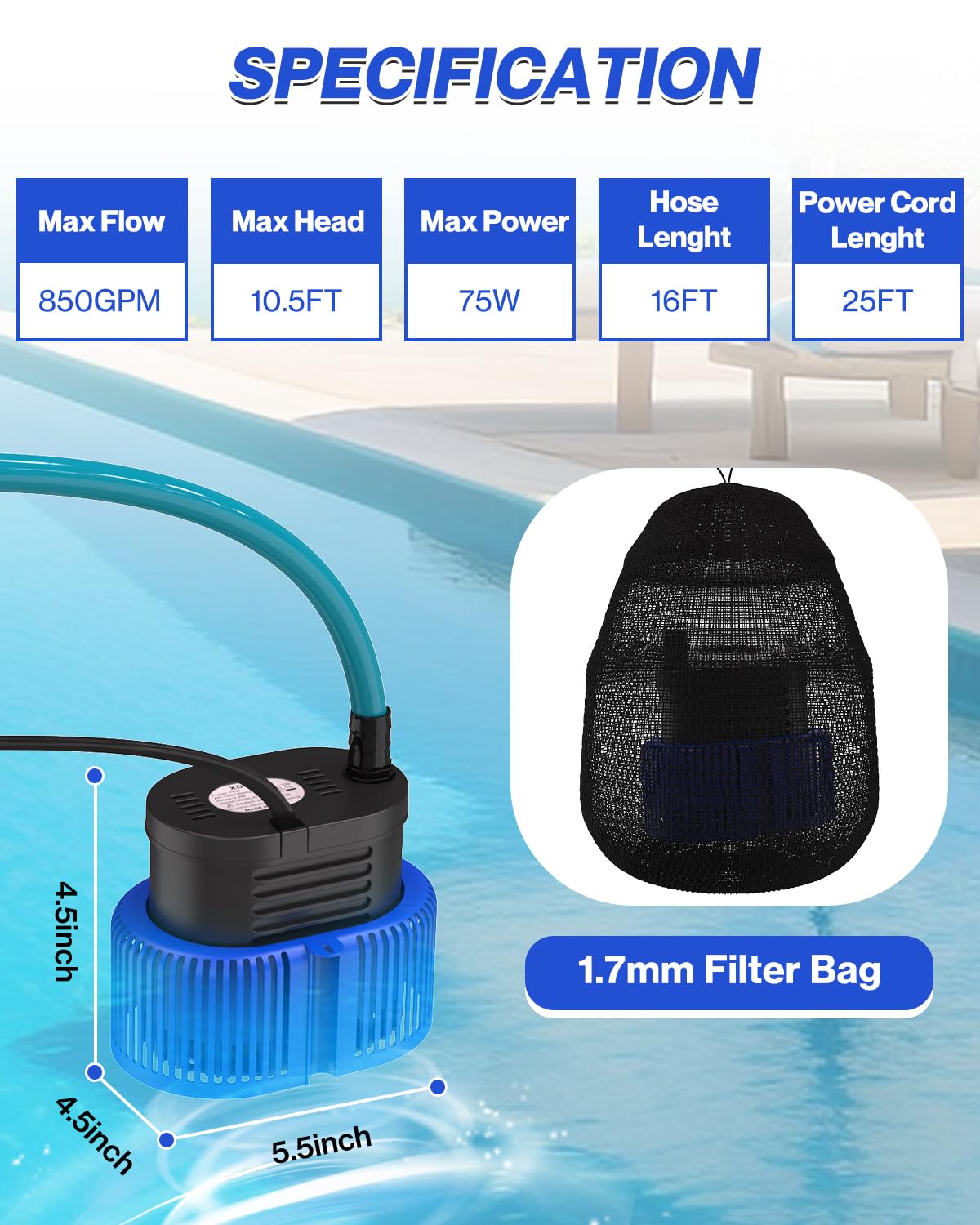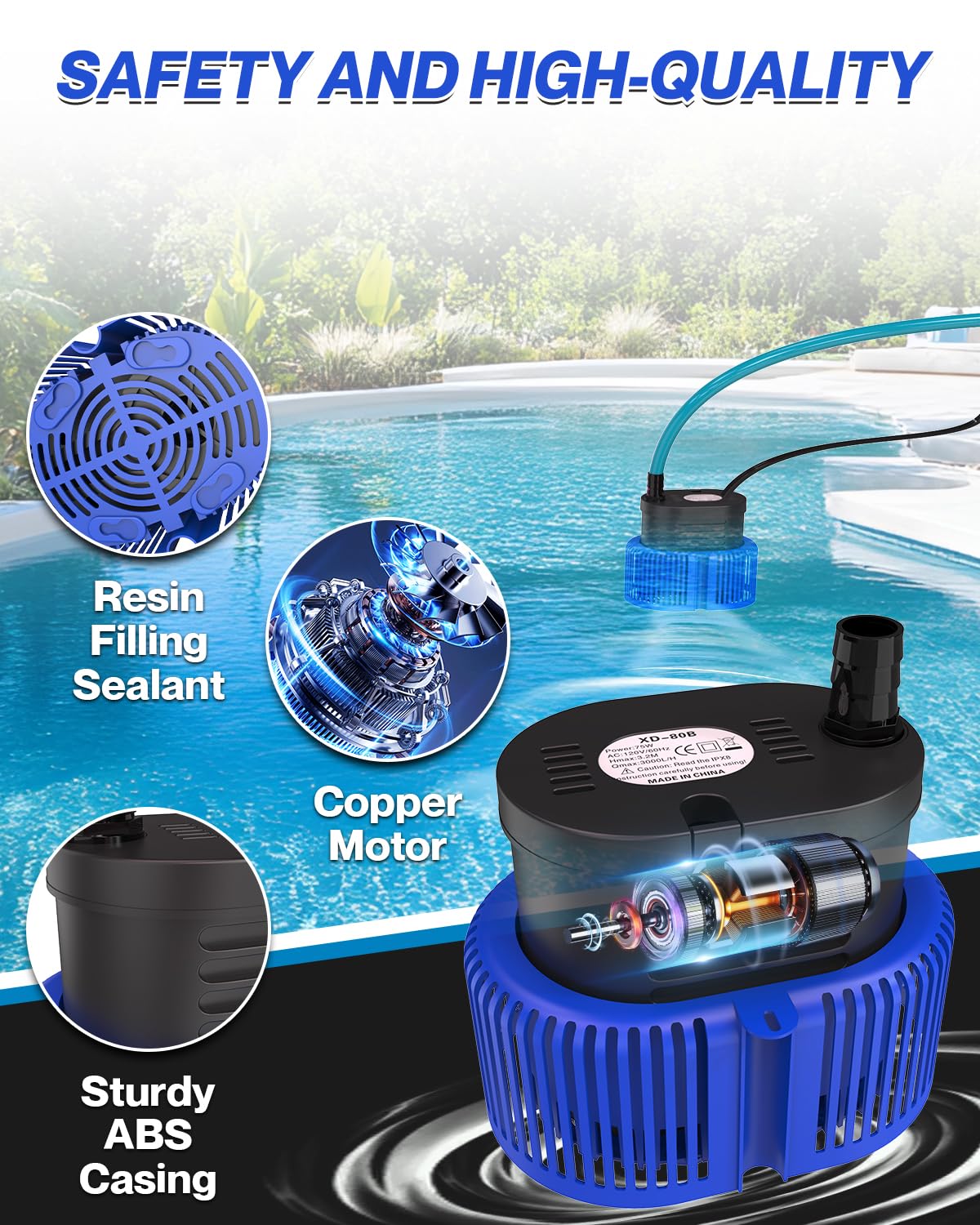 Good compatibility: The 16 ft anti-twist drainage hose of pool drain pump is suitable for the 1/2 " water nozzle and can drain from any depth of the pool. 3/4" water nozzle and 3/4”crooked water nozzle is suitable for drainage hoses and garden hoses. The 25 ft power cord increases the distance between the socket and the water to prevent electric shock