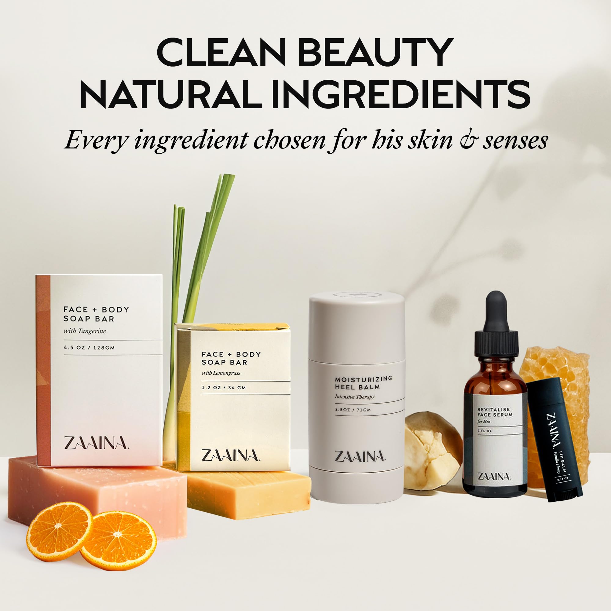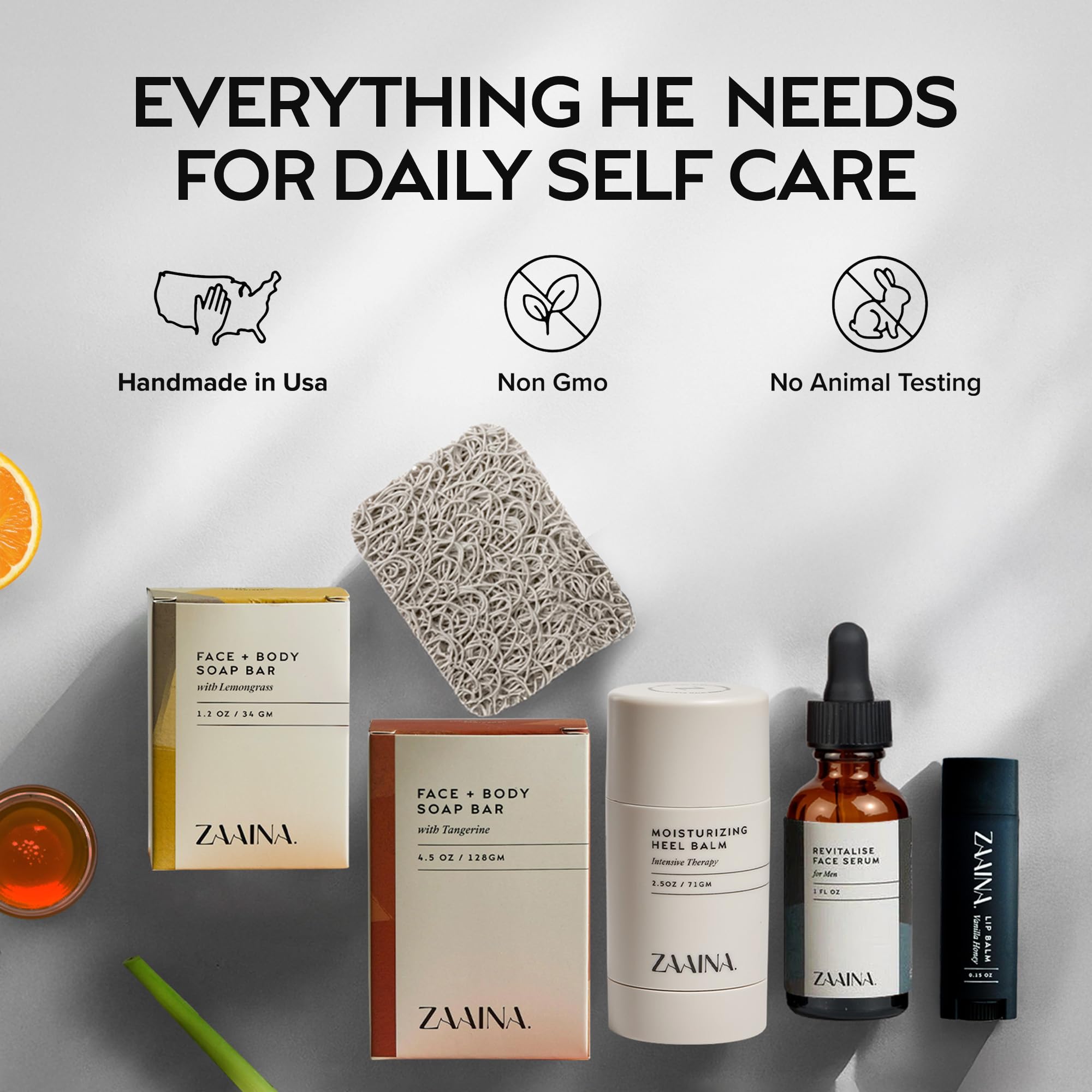 COMPLETE SPA EXPERIENCE FOR MEN: Our luxury spa kit for men includes face serum, tangerine & lemongrass soaps, heel balm, lip balm & soap coaster β all-natural grooming essentials for daily self care and relaxation.
