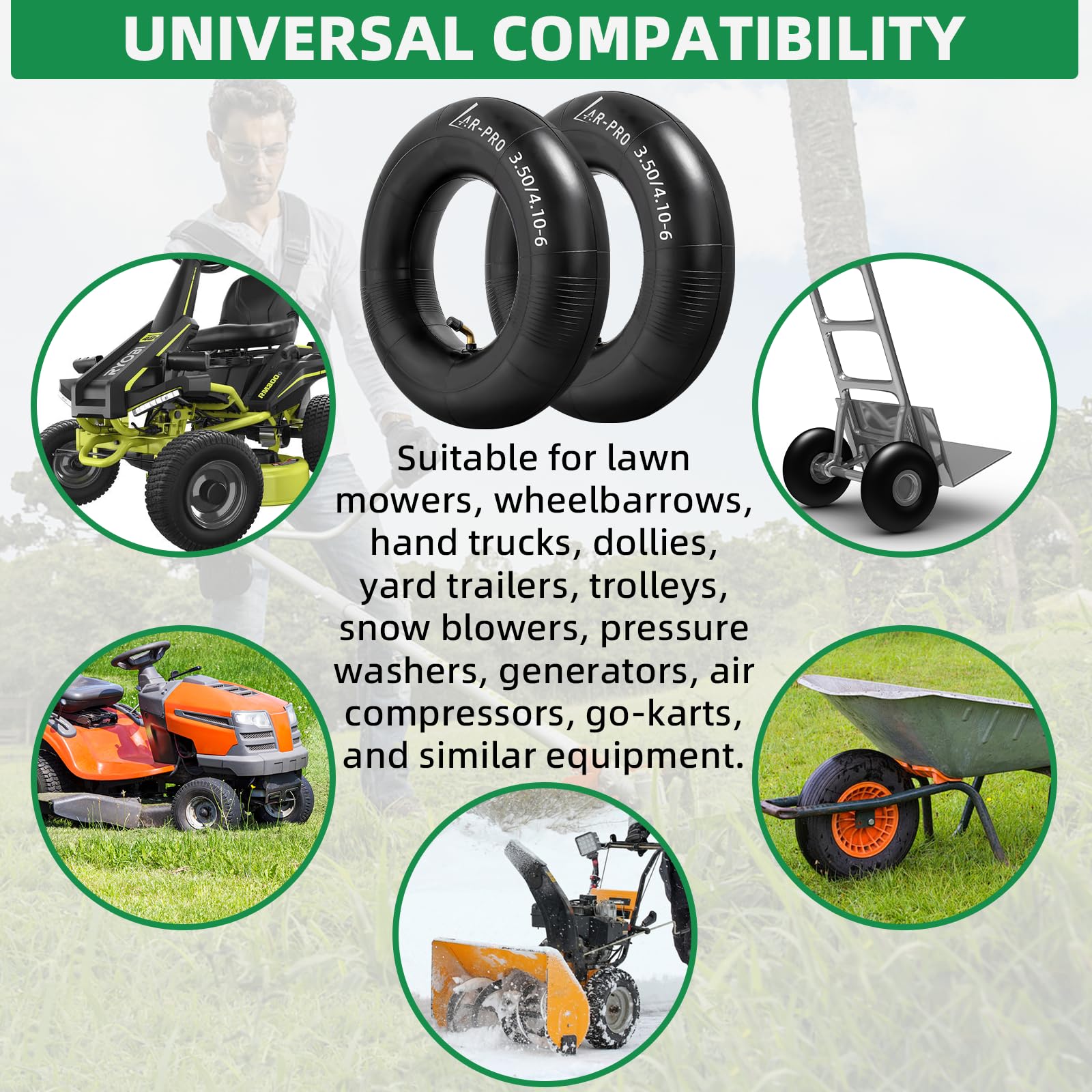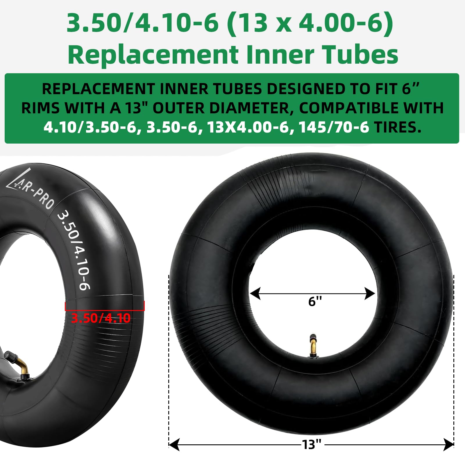 Wide Compatibility Fit - Replacement inner tubes designed to fit 6” rims with a 13" outer diameter, compatible with 4.10/3.50-6, 3.50-6, 13x4.00-6, 145/70-6 tires. Suitable for lawn mowers, wheelbarrows, hand trucks, dollies, yard trailers, trolleys, snow blowers, pressure washers, generators, air compressors, go-karts, and similar equipment.