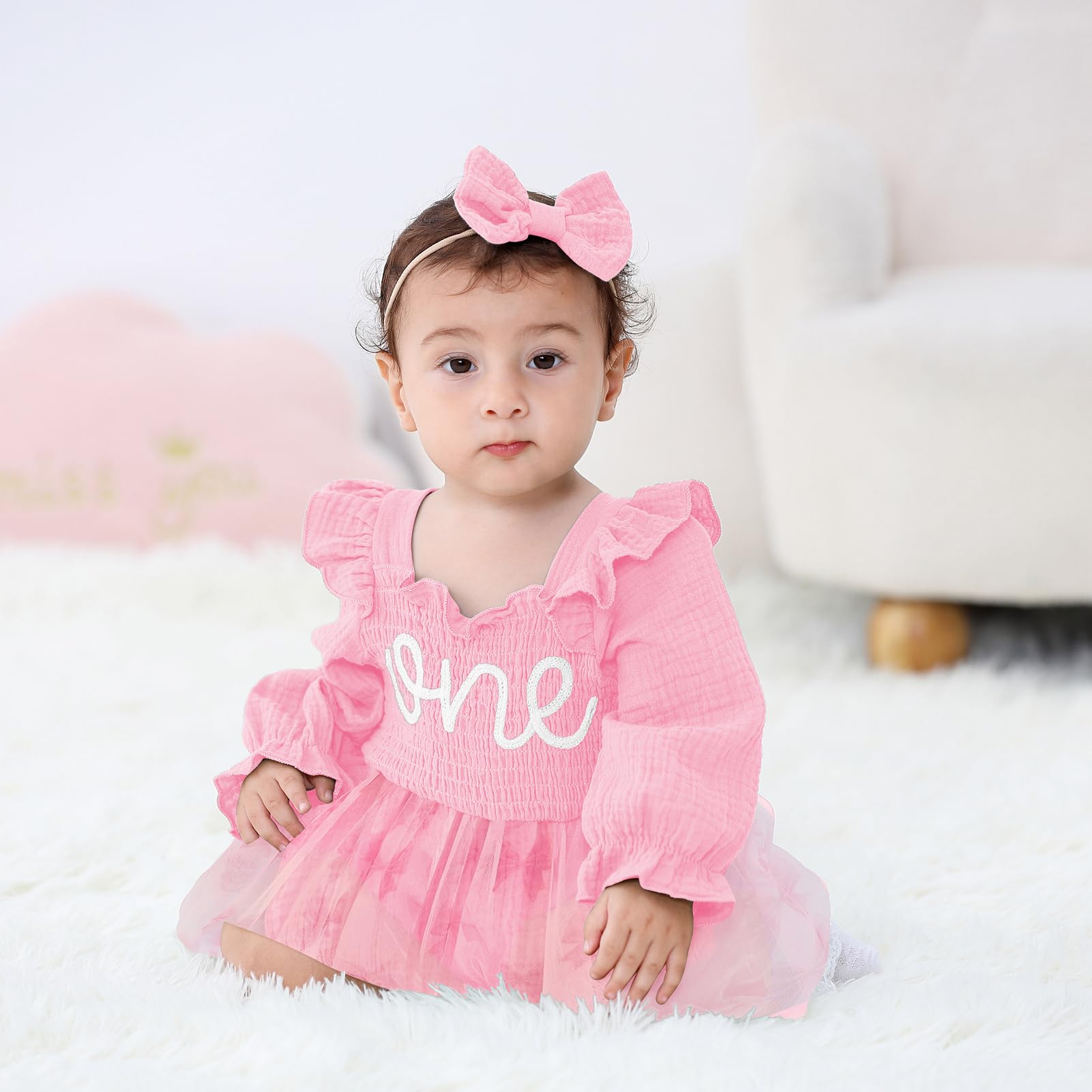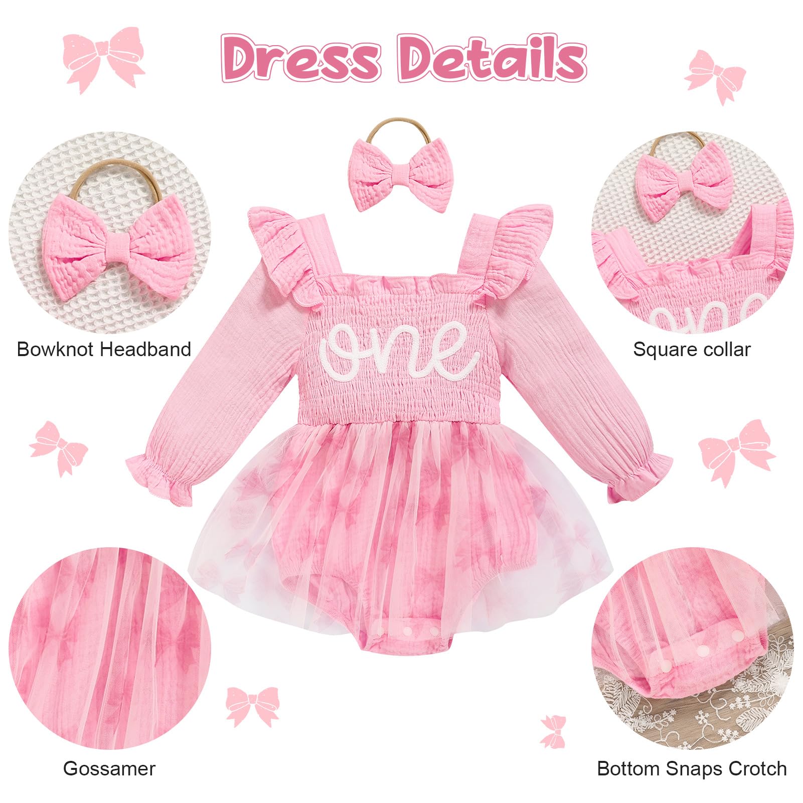 Design: Newborn baby girl playwear romper dress with long sleeve, solid color, multi-layered tulle, Snap leg openings for easy diaper changes, easier morning for novice mother.Cute princess 1st birthday outfit, fashionable and adorable embroidery ONE printed themed birthday clothes perfect for creating beautiful memory of her first birthday.