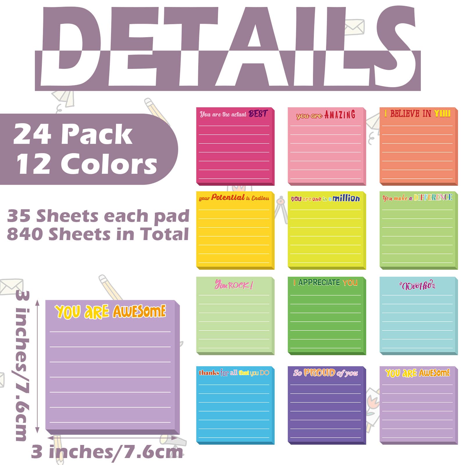 Adequate Quantity and Styles: you will receive 24 pads of sticky notes, including 12 colors, 2 pads for each color, 35 sheets for each pad, a total of 24 pads; Sufficient quantity and various styles can meet your various needs, you can also share with your family and friends