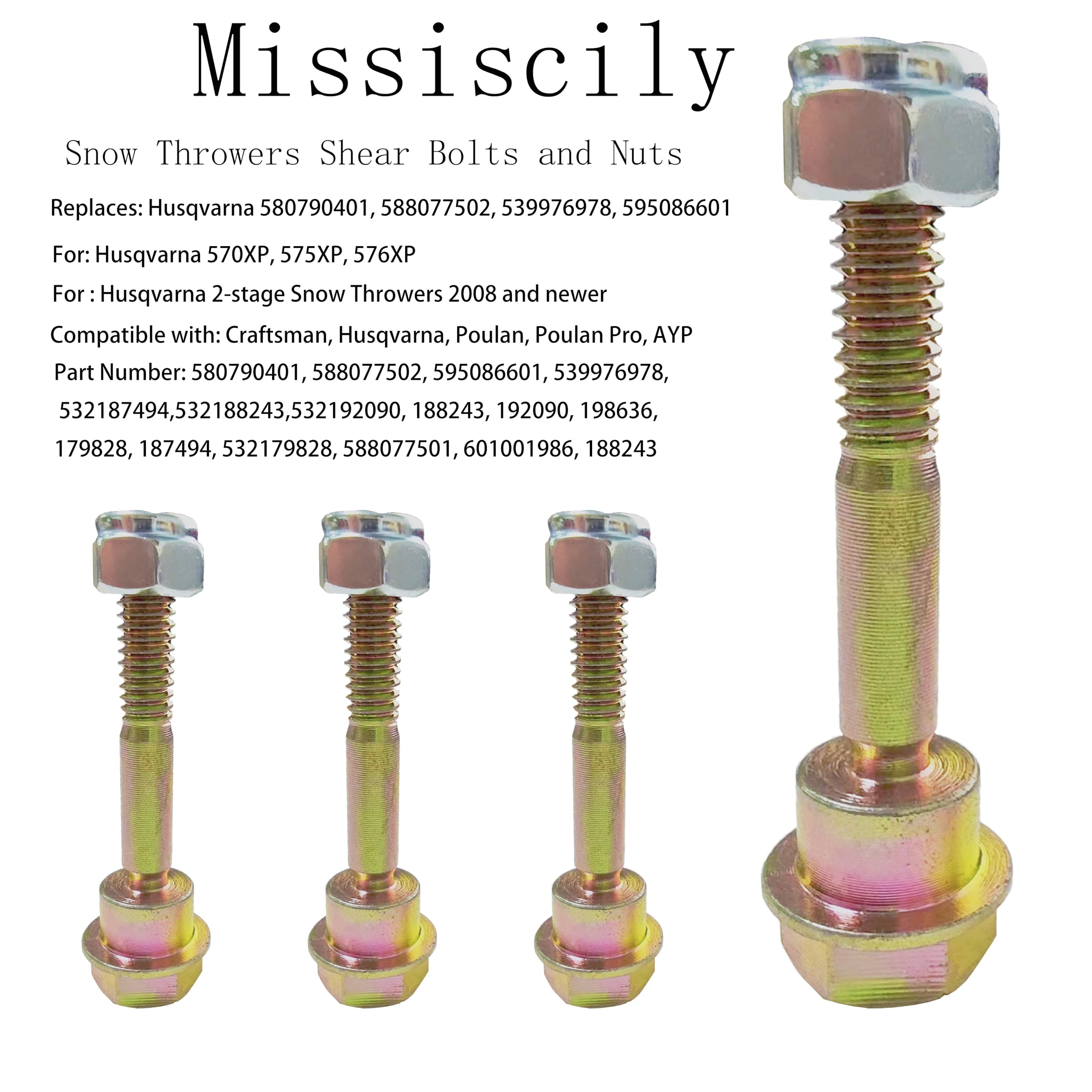 (4/Pack) 580790401 Shear Pins Bolts & Nuts Kit for fits Husqvarna 2-stage Snow Throwers 2008 and newer