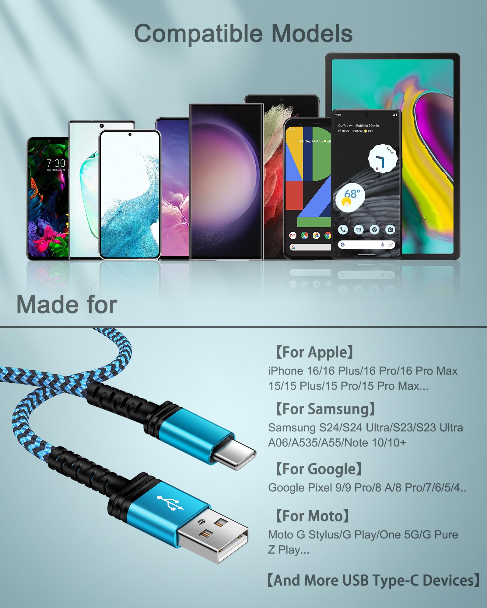 【WIDELY COMPATIBILITY】- USB C port charger powerline works for iPhone 16e/16/16 Pro/16 Pro Max/16 Plus; 15/15 Pro/15 Pro Max/15 Plus; Samsung Galaxy S25 Ultra/S25+/S25, S24 Ultra/S24+/S24, S23 Ultra/S23+/S23, S22 Ultra/S22/S21/S20, Note20 5G/Note10+ 5G, A17/A16/A15/A14/A13, Z Fold 7/6, Z Flip 7/6; Google Pixel 10 Pro XL/10 Pro/10/10 Pro Fold, 9 Pro XL/9 Pro/9/9 Fold, 8 Pro/8a/8, 7 Pro/7a/7, 6 Pro/6; plus Fire HD 10 Gen, Moto, OnePlus, Droid, C-Type devices.