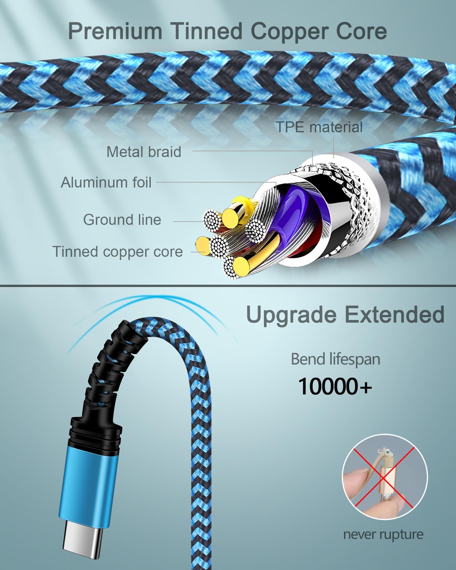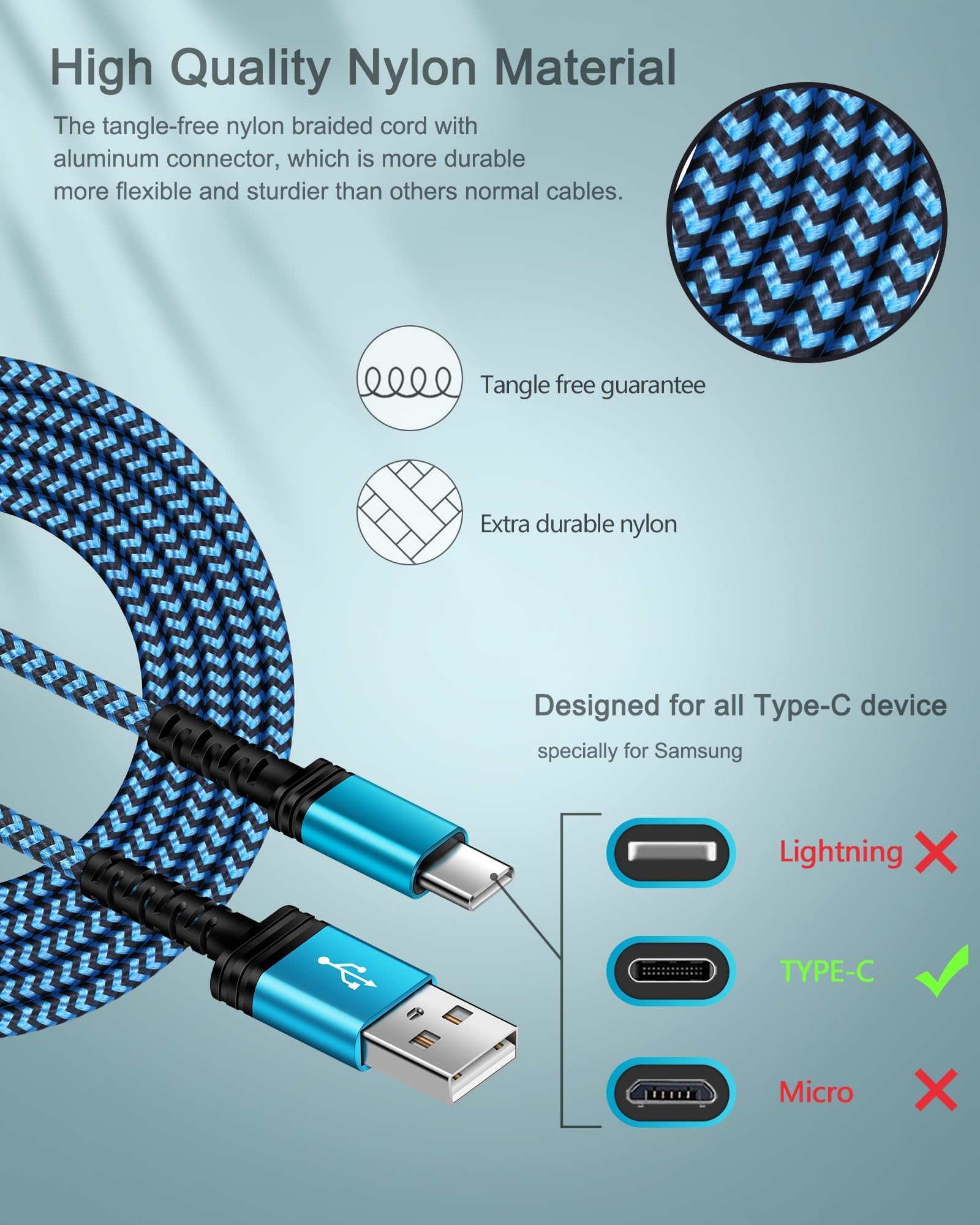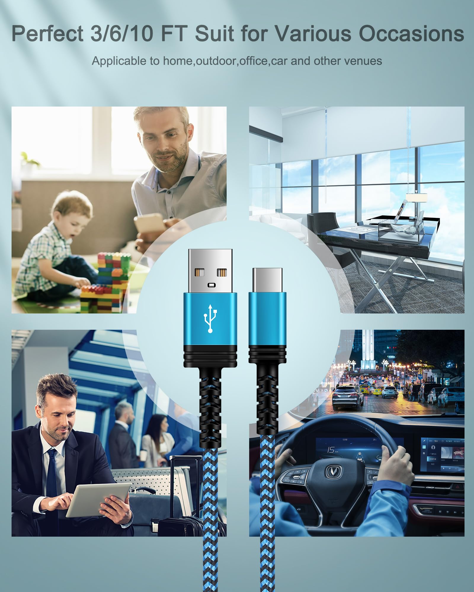 CONVENIENT USB C Cords - These different lengths of long cords allow you to adjust the cable's 3/6/10ft length for any situation. Like your power bank, or car, far from your sofa or bed. 3-pack multi-color cables offer you more convenience on traveling, in the office, kitchen, living room, and sharing with families.