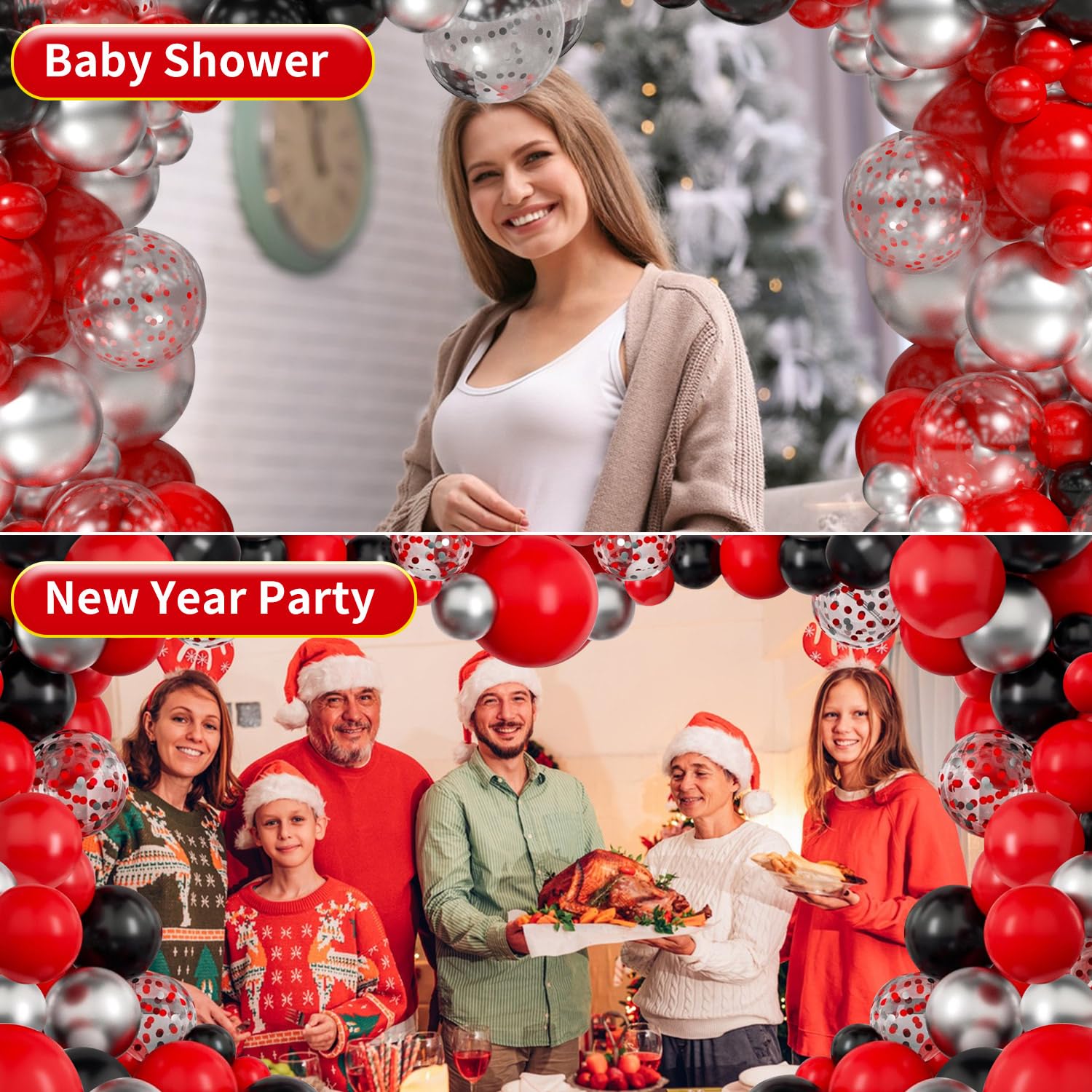 【Red Black Balloons Arch】140pcs black red silver arch kit with different color and size include:12"(black+red)*30pcs,12"metallic silver*20pcs,12"(confetti silver + confetti red)*10pcs,5"(black+red)*15pcs,5"metallic silver*10pcs,glue*1,balloon ribbon*1,balloon strip tape*1.Conplete black red party decorations.