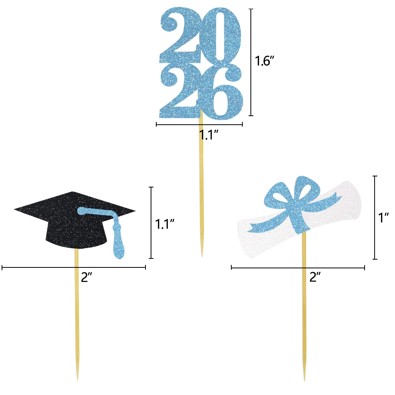 The small 2026 grad number topper measures 1.1 inches wide and 1.6 inches tall, glitter grad hat measures 2 inches wide and 1.1 inches tall, glitter grad diploma measures 2 inches wide and 1 inches tall