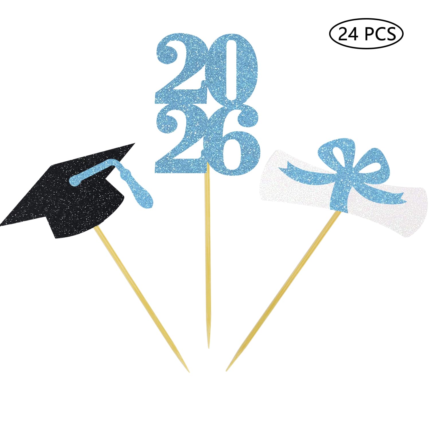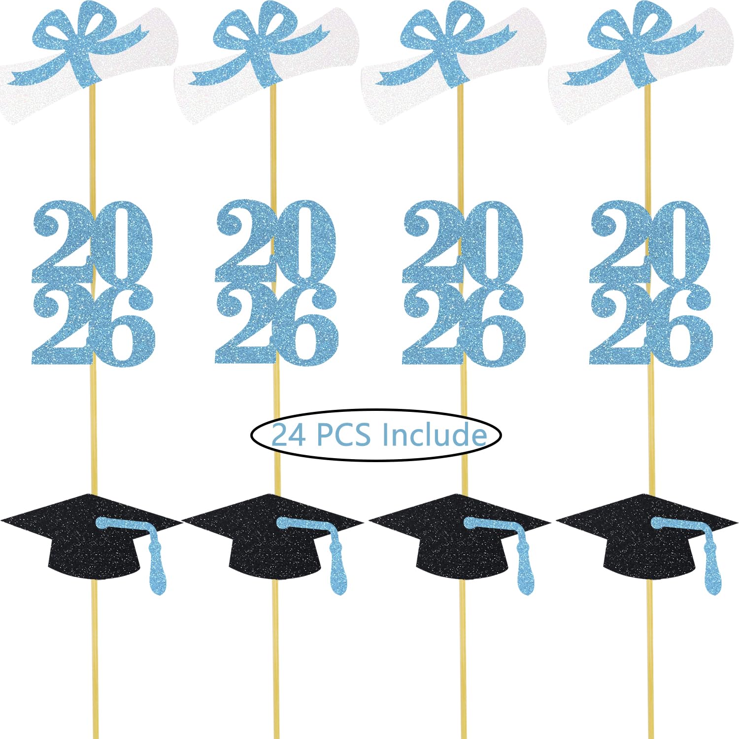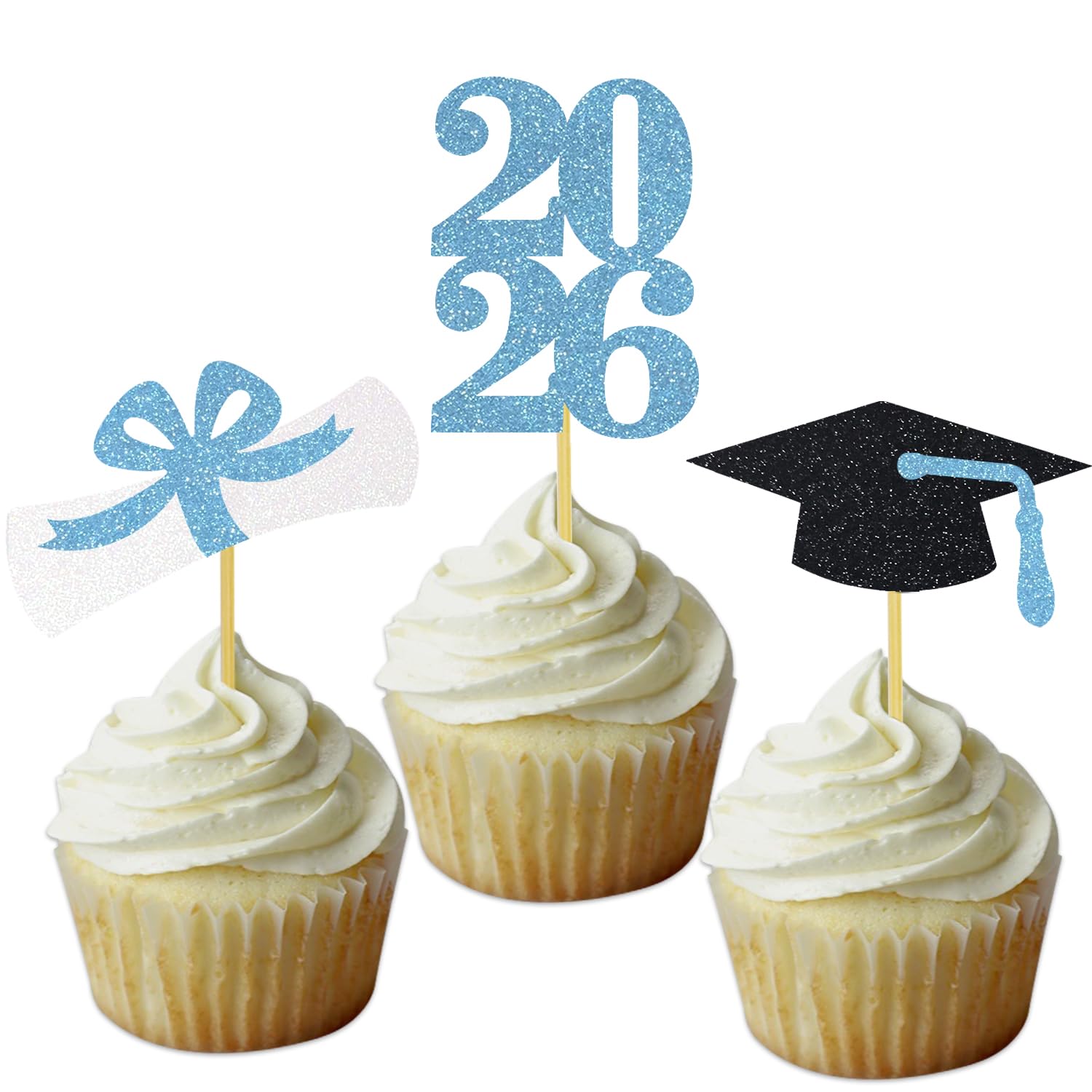 2026 graduation cap cupcake toppers: 8 pcs black grad cap cupcake toppers with light blue tassel, 8 pcs light blue 2026 number cupcake toppers, 8 pcs white and light blue diploma bow cupcake toppers