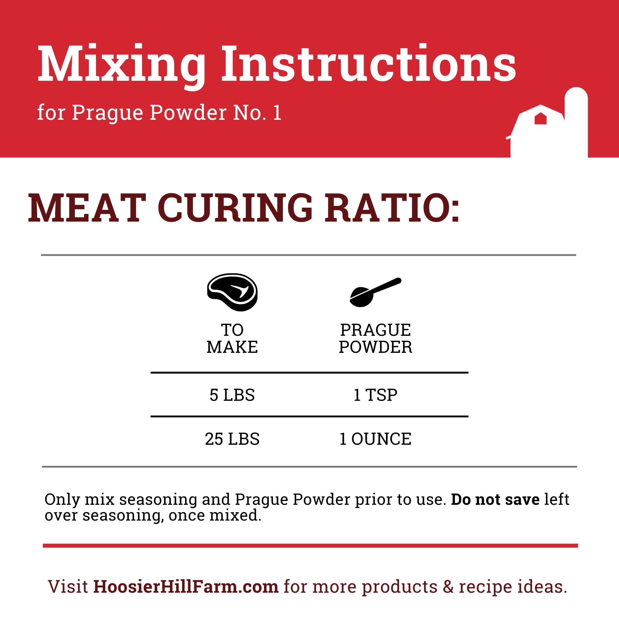 Use 1 ounce (equivalent to 6 teaspoons, or 2 tablespoons) of Prague Powder for 25 pounds of meat, or 1 level teaspoon of cure for 5 pounds of meat. Mix curing salt with cold water to dissolve, or add it to your marinade or brine and mix well.