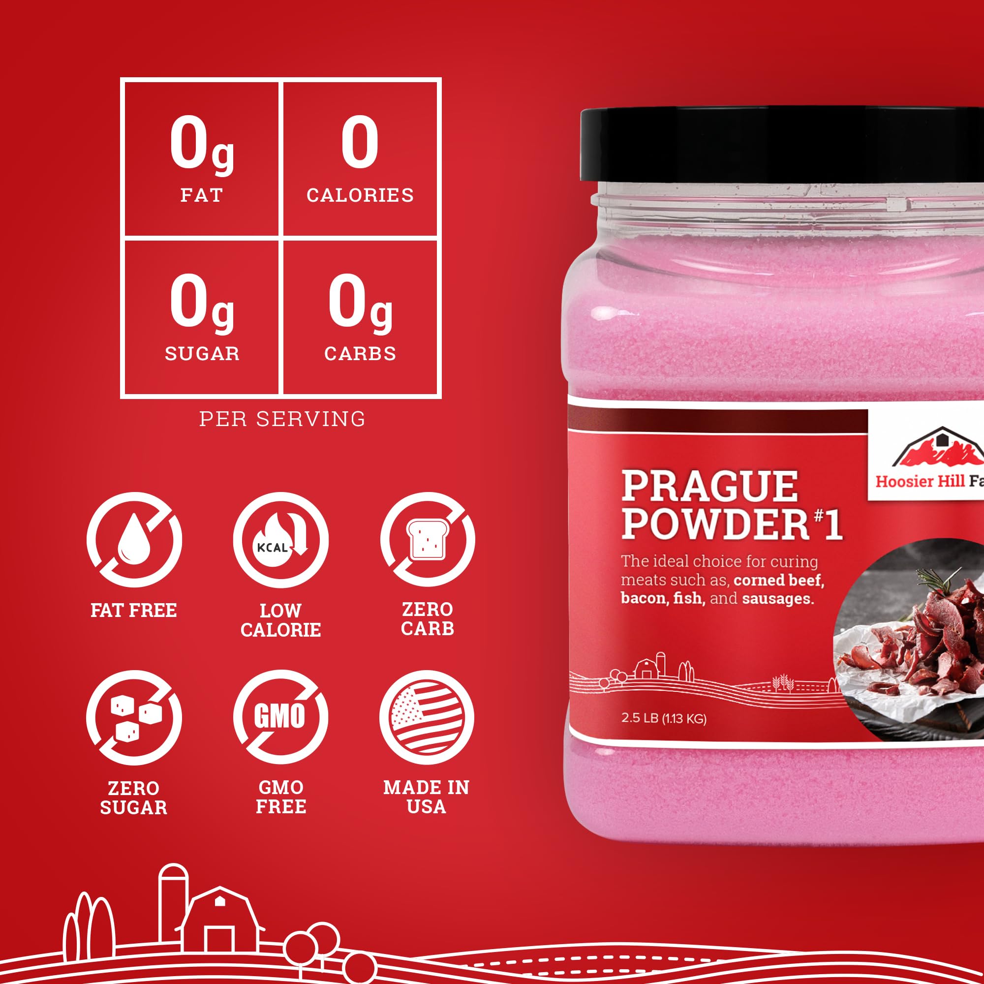 Hoosier Hill Farm Prague Powder No. 1 is also referred to as Tinted Cure, Insta Cure, or Pink Curing Salt. It is an essential food preservative used for curing meats that require a wet curing process. This includes a variety of short cure preparations like sausage, corned beef, country ham, bacon, and a variety of fish. In addition, it can be used when making jerky or smoking meats. Made from a combination of table salt and sodium nitrite, curing salt prevents bacteria growth and food poisoning while maintaining your meat’s flavor and appearance. Each container of Prague Powder holds enough to cure 100 pounds of meat.
