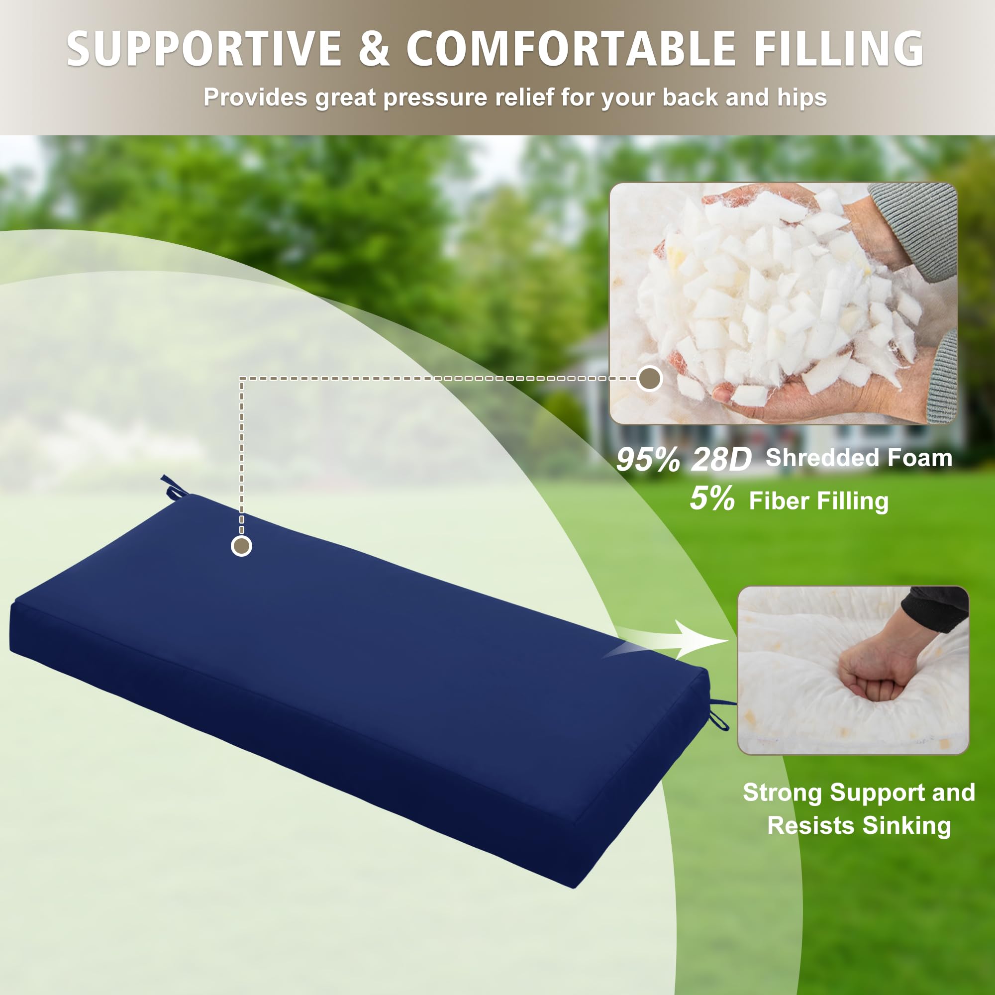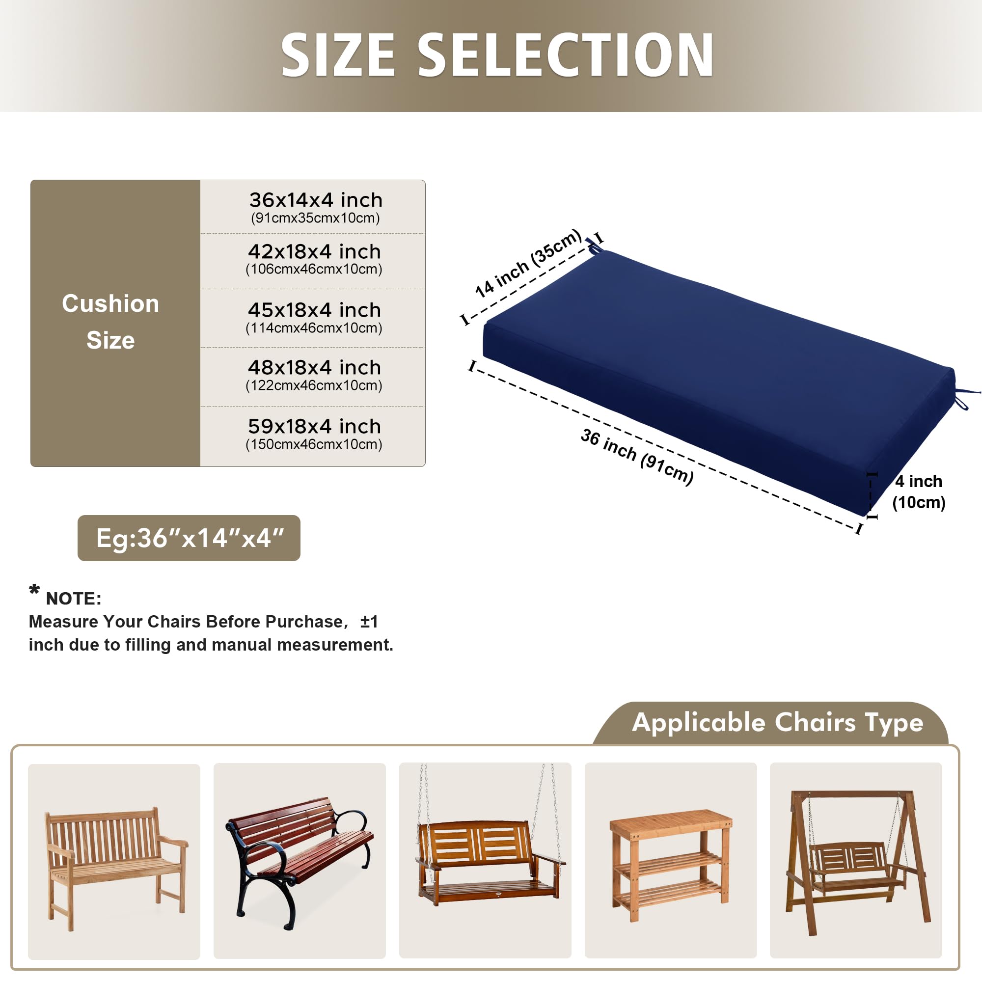 【Enhanced Comfort & Support】: Filled with high-resilience shredded foam, our outdoor bench cushions provide optimal comfort, reducing pressure on your hips. Available in multiple sizes (36"x14", 42"x18", 45"x18", 48"x18", 59"x18"), they offer a plush, supportive seating experience for patio benches, loveseats, entryway benches, piano benches, or porch swings.