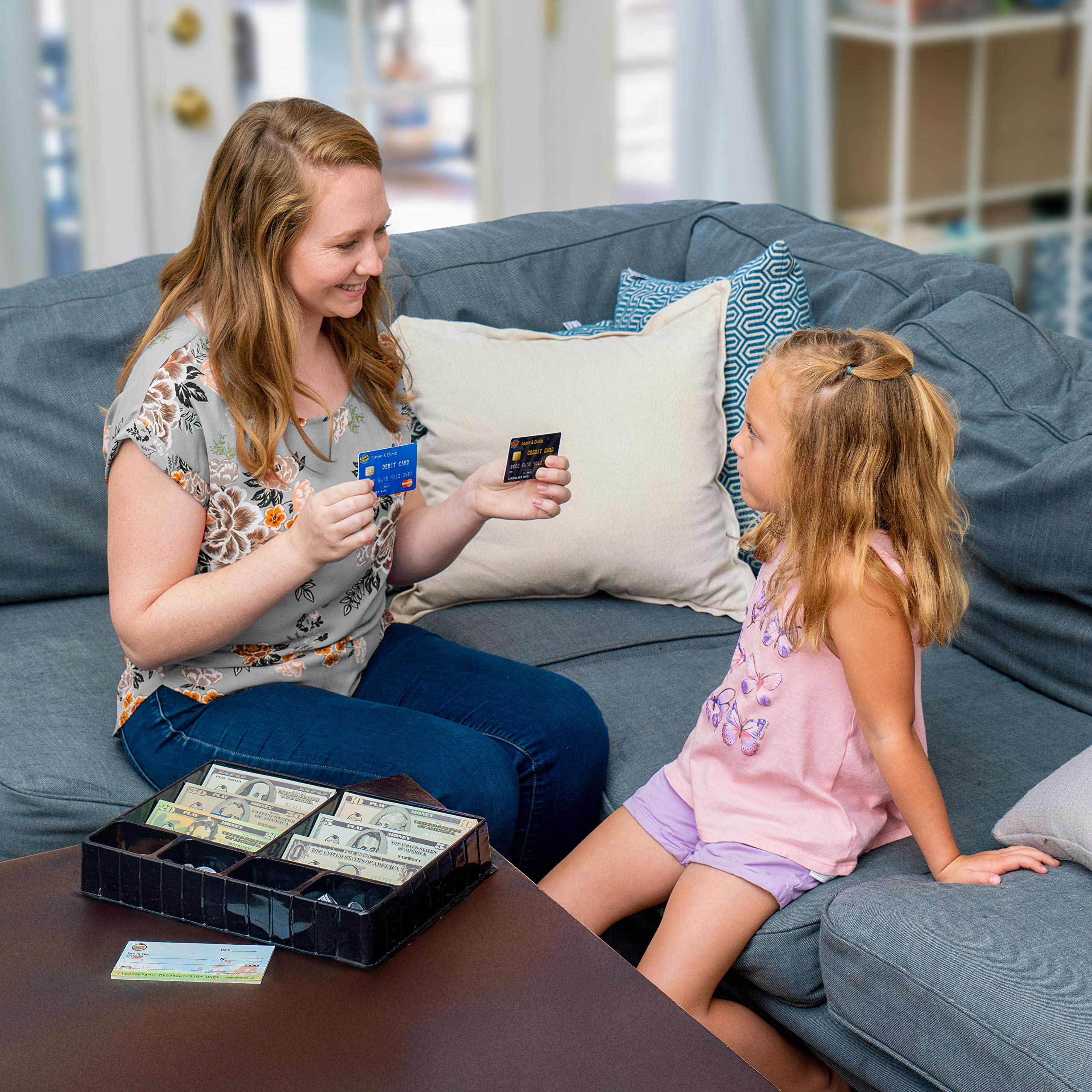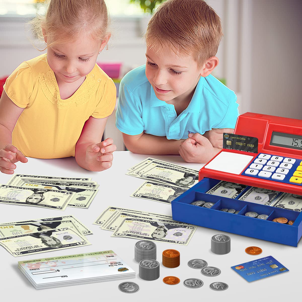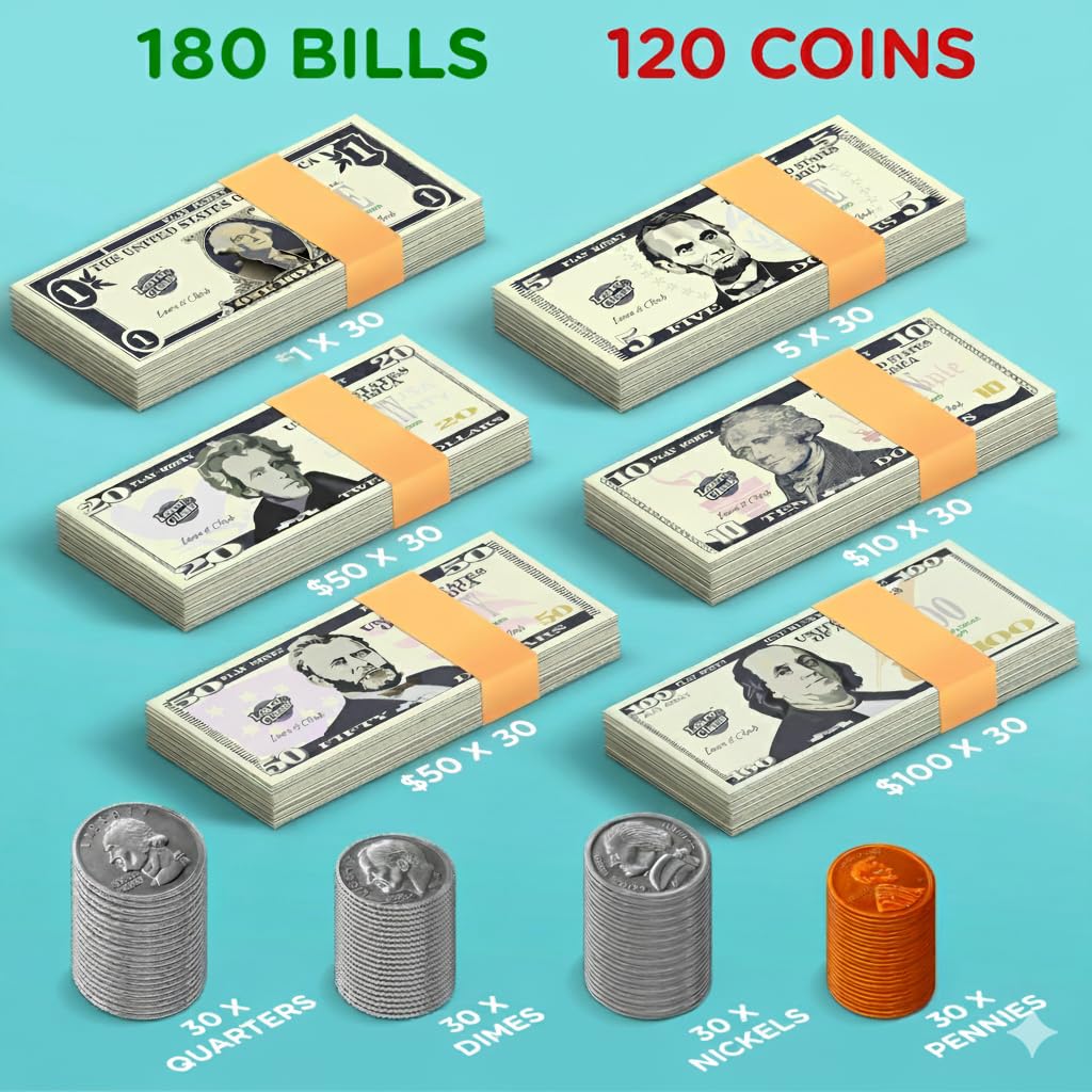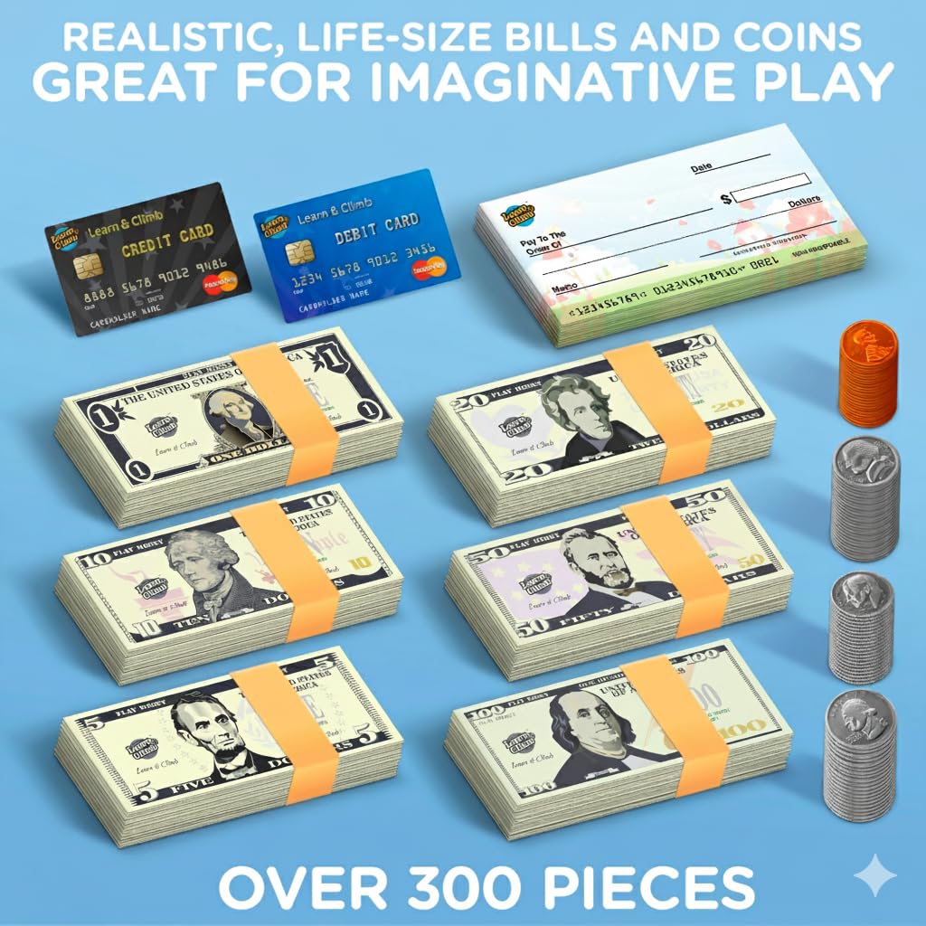 Play, Learn & Earn money set is bursting with over 300 realistic looking pieces! This set includes 180 paper bills- 30 of each bill denomination $1, $5, $10, $20. $50, $100 and 120 plastic coins- 30 of each Pennies, Nickels, Dimes, and Quarters! It also comes with a realistic looking checkbook, credit card, and debit cart.