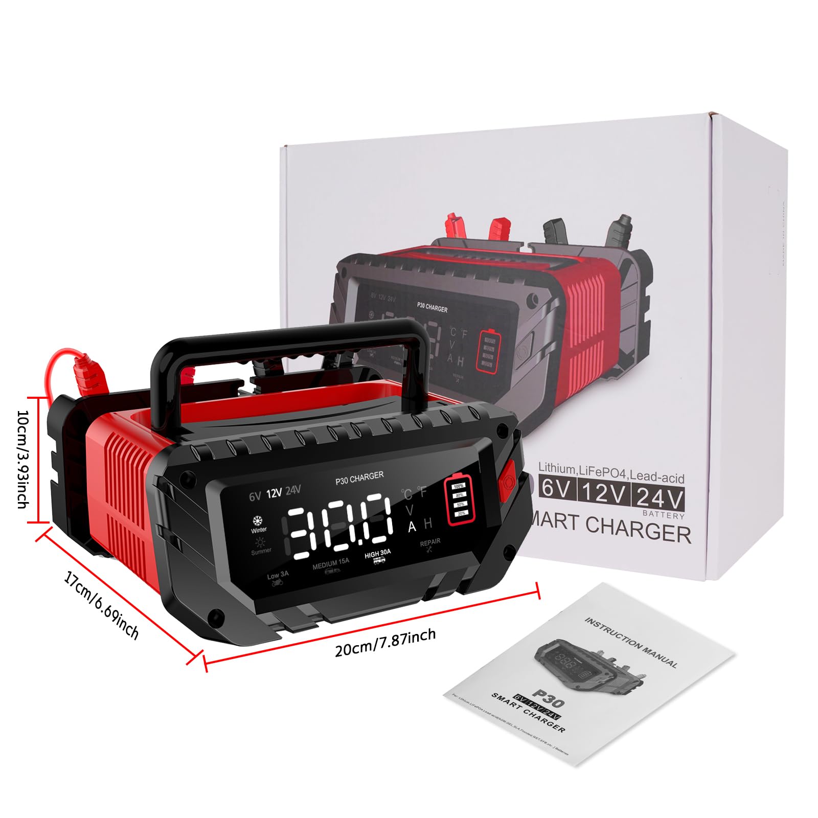 【3-Level Adjustable Current】Car Battery Charger can choose suitable charging current by yourself,you can choose current LOW(6V/2A,12V/3A,24V/5A)→MEDIUM(6V/5A, 12V/15A, 24V/10A)→HIGH((6V/10A,12V/30A,24V/16A).Please select the appropriate current to charge your battery according to your needs.