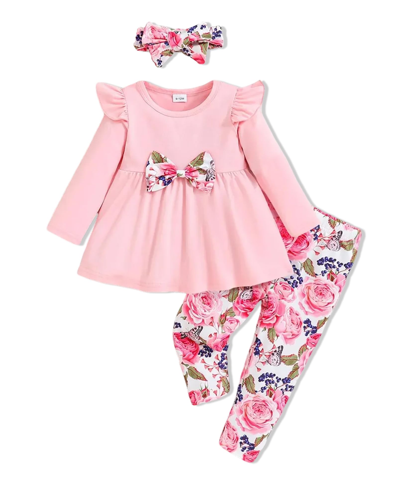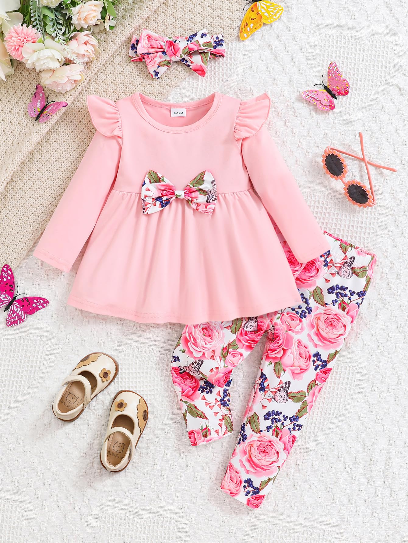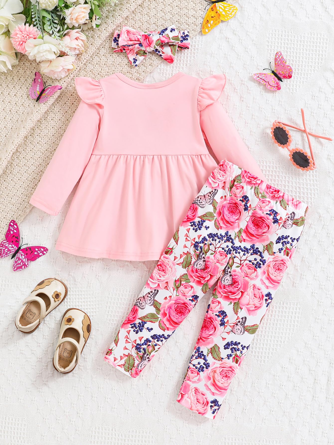 🎁Great-Gift Set for Toddler Girl :Packed 3-piece set (cute shirt+ soft pants + floral headband) in packaging. Makes birthdays or holidays effortless.