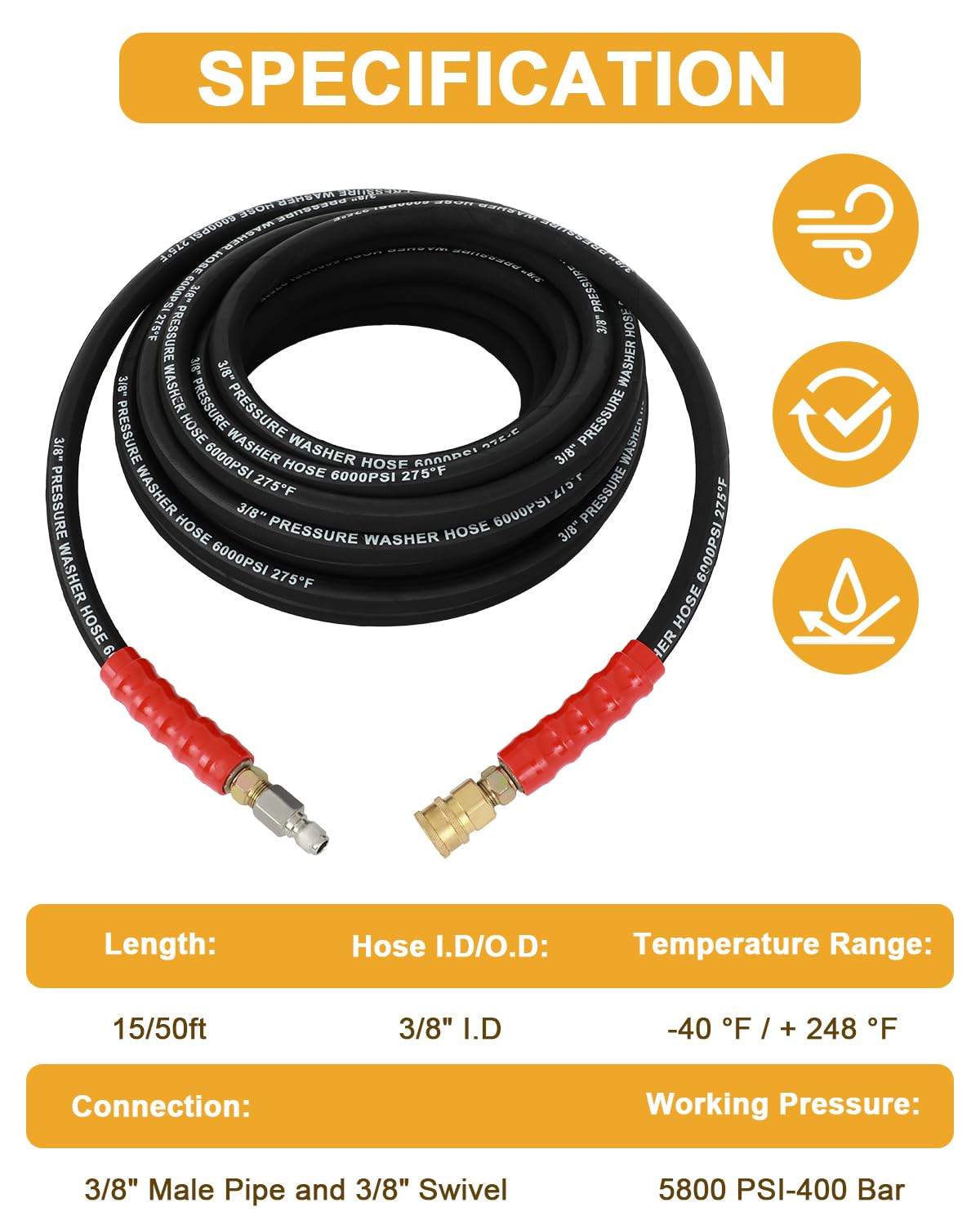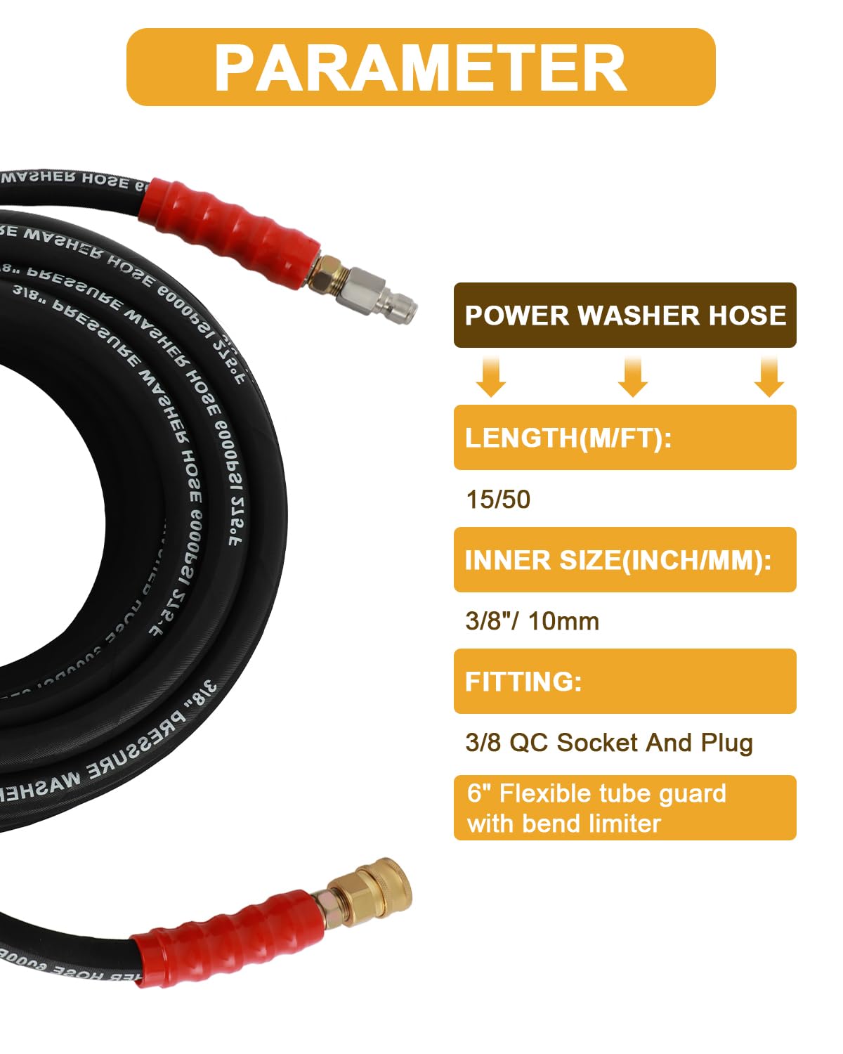Performance:Guards with Bend Restrictors: The package also includes 6-inch hose guards with bend restrictors. These guards are designed to avoid the hose from wear and tear, particularly at points where it may experience bending or flexing