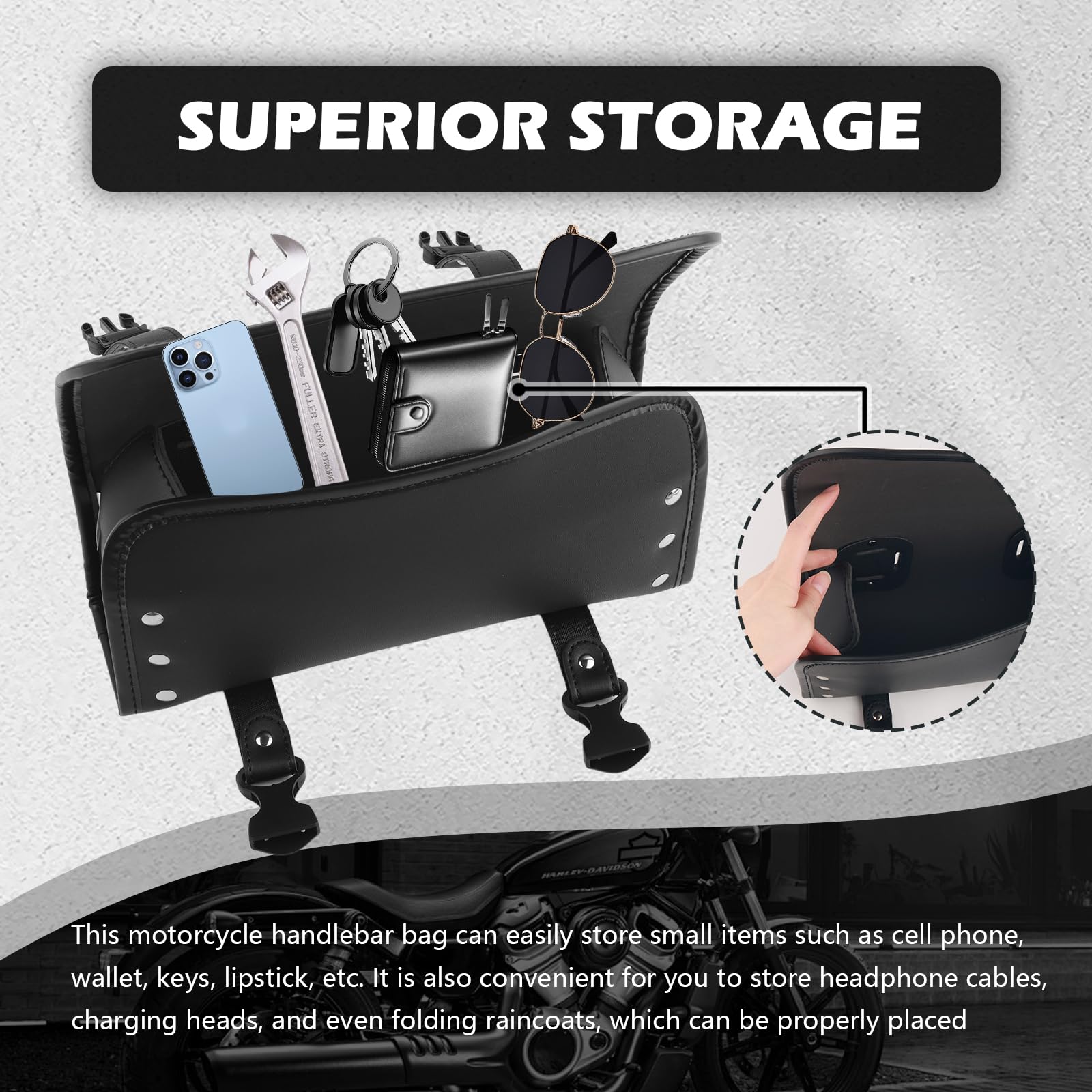 SUPERIOR STORAGE: This motorcycle handlebar bag can easily store small items such as cell phone, wallet, keys, lipstick, etc. It is also convenient for you to store headphone cables, charging heads, and even folding raincoats, which can be properly placed