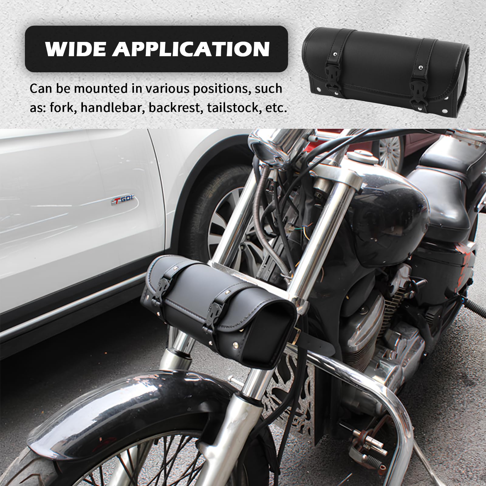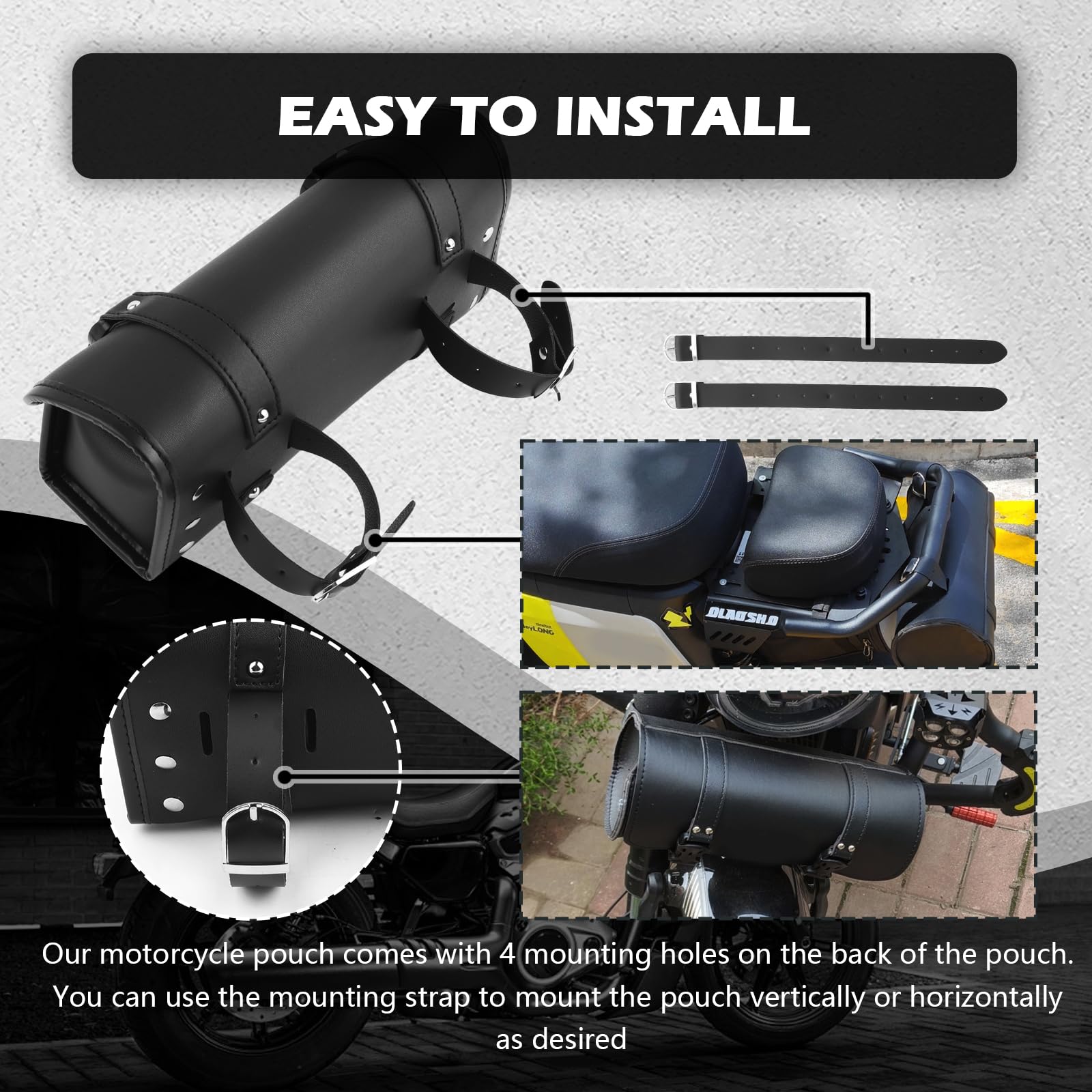 PREMIUM LEATHER HARDCORE PROTECTION, MULTI-DIRECTIONAL FIXATION IS NOT EASY TO SHIFT, EASY TO RIDE STORAGE Product Attributes Colors: Black Sizes: 12.08×4.92×3.62 inch Weight: 11.96 oz Material: Artificial Leather Packaging: 1* Motorcycle Handlebar Bag + 2* Adjustable Mounting Straps Product Feature & Functions 1. Front access pockets, cell phone, keys, change at hand, no more fumbling on the ride 2. Waterproof and wear-resistant fabric, no fear of wind and rain, to protect the items dry and safe 3. Buckle fixing system, no shifting even in high-speed cornering, more focused riding Installation Tips Our motorcycle pouch comes with 4 mounting holes on the back of the pouch. You can use the mounting strap to mount the pouch vertically or horizontally as desired