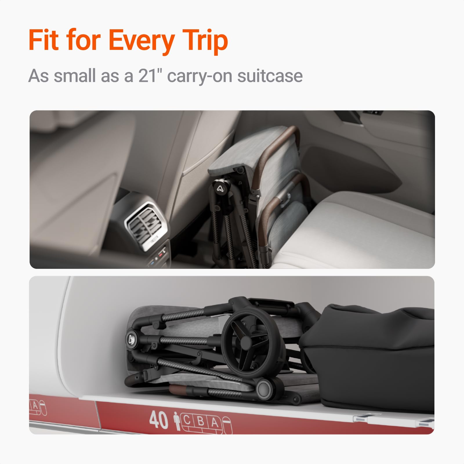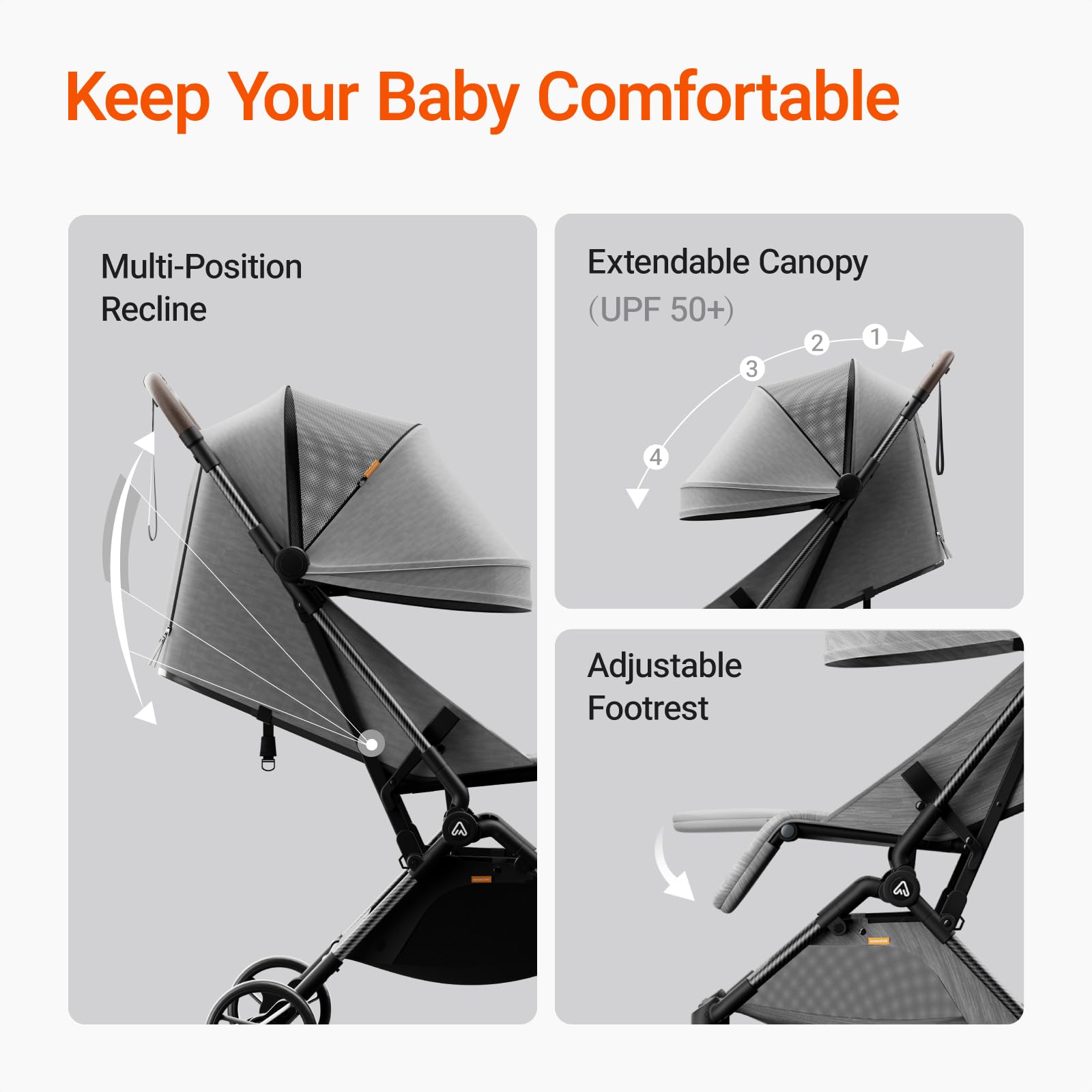 Compact & Lightweight Design: Say goodbye to bulky strollers that make travel a hassle. Our baby stroller boasts compact design that effortlessly folds down into a compact size. Weighing in at just 11.6 pounds, thanks to its advanced carbon fiber frame, ensuring a hassle-free experience wherever you go. This innovative material not only provides exceptional durability but also allows for an incredibly lightweight construction, making it a breeze to store in trunks or overhead bins on airplanes.
