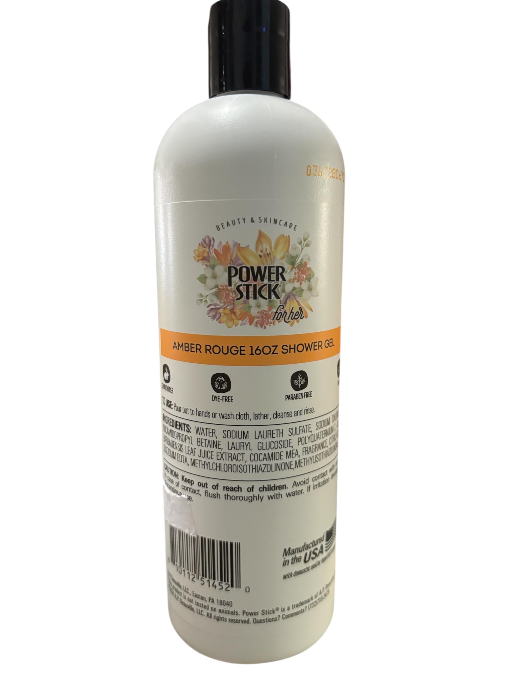 Power Stick Shower Gel AMBER ROUGE with Notes of Jasmine, Saffron & Amberwood, 16 oz : Elevate your shower experience with Power Stick Shower Gel in the captivating scent of AMBER ROUGE. Immerse yourself in the luxurious blend of Jasmine, Saffron, and Amberwood that evokes a sense of opulence and sophistication. This indulgent shower gel not only cleanses and refreshes your skin but also envelops you in a rich, exotic fragrance that lingers throughout the day. Key Features: Luxurious Fragrance: Infused with notes of Jasmine, Saffron, and Amberwood for a decadent shower experience. Invigorating Cleanse: Provides a thorough and revitalizing cleanse to leave your skin feeling refreshed. Skin Pampering: Hydrates and nourishes the skin, promoting softness and smoothness. Aromatic Delight: Transport yourself to a world of luxury and indulgence with every use. Convenient Size: Generous 16 oz bottle ensures long-lasting enjoyment of this exquisite scent. Benefits: Captivating Fragrance: Leaves a lingering scent of Jasmine, Saffron, and Amberwood on your skin. Nourishing Formula: Cleanses while moisturizing your skin, enhancing overall skin health. Invigorating Experience: Turn your daily shower into a moment of self-care and relaxation. Suitable for Daily Use: Enjoy the opulence of this premium shower gel as part of your routine. Elevated Grooming: Treat yourself to a luxurious experience that revitalizes and pampers your skin
